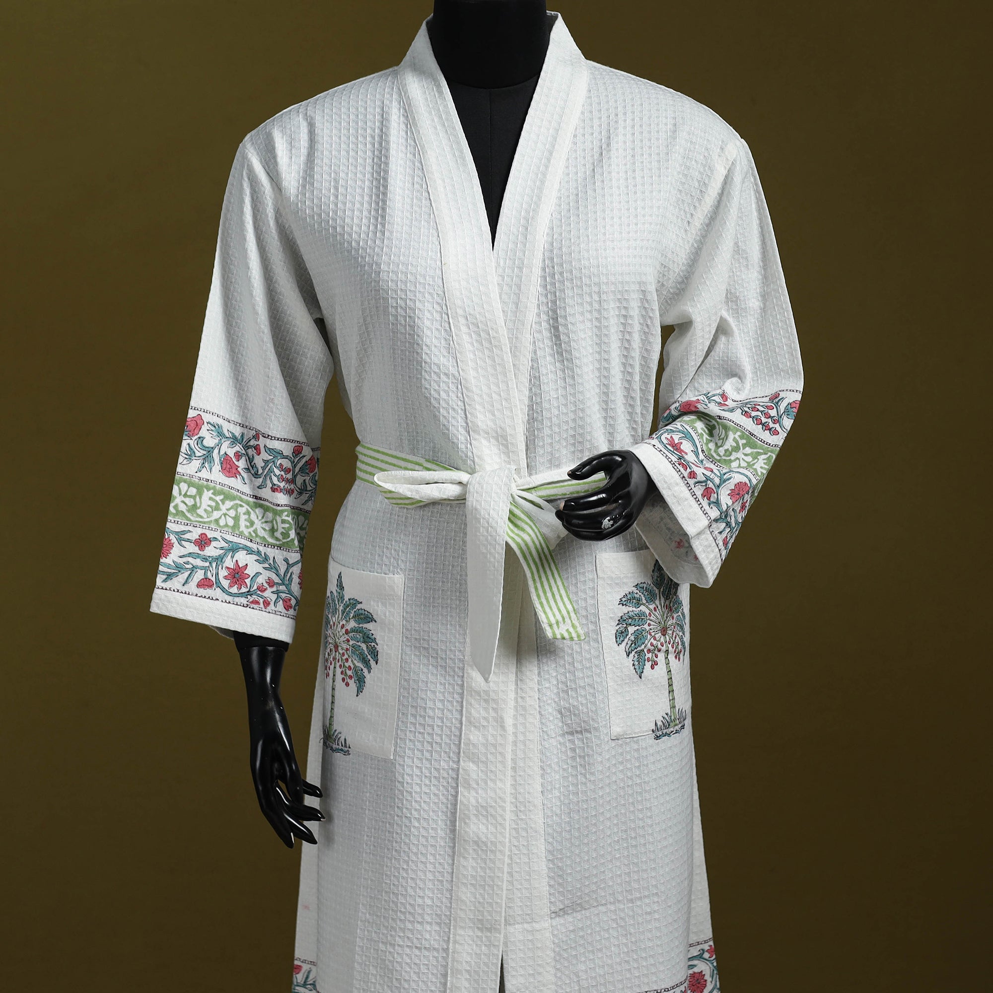 White sanganeri block print waffle weave bath robe is crafted in Rajasthan by artisans Ashok Kumar Chhipa and Lalit Kishore Chhipa using handwoven cotton with a 6-shaft weave for better absorbency. It features vibrant VAT-dyed prints two side pockets for convenience and a separate belt for a comfortable fit. Lightweight breathable and easy to wear it is ideal for showers, spa days or relaxing mornings.