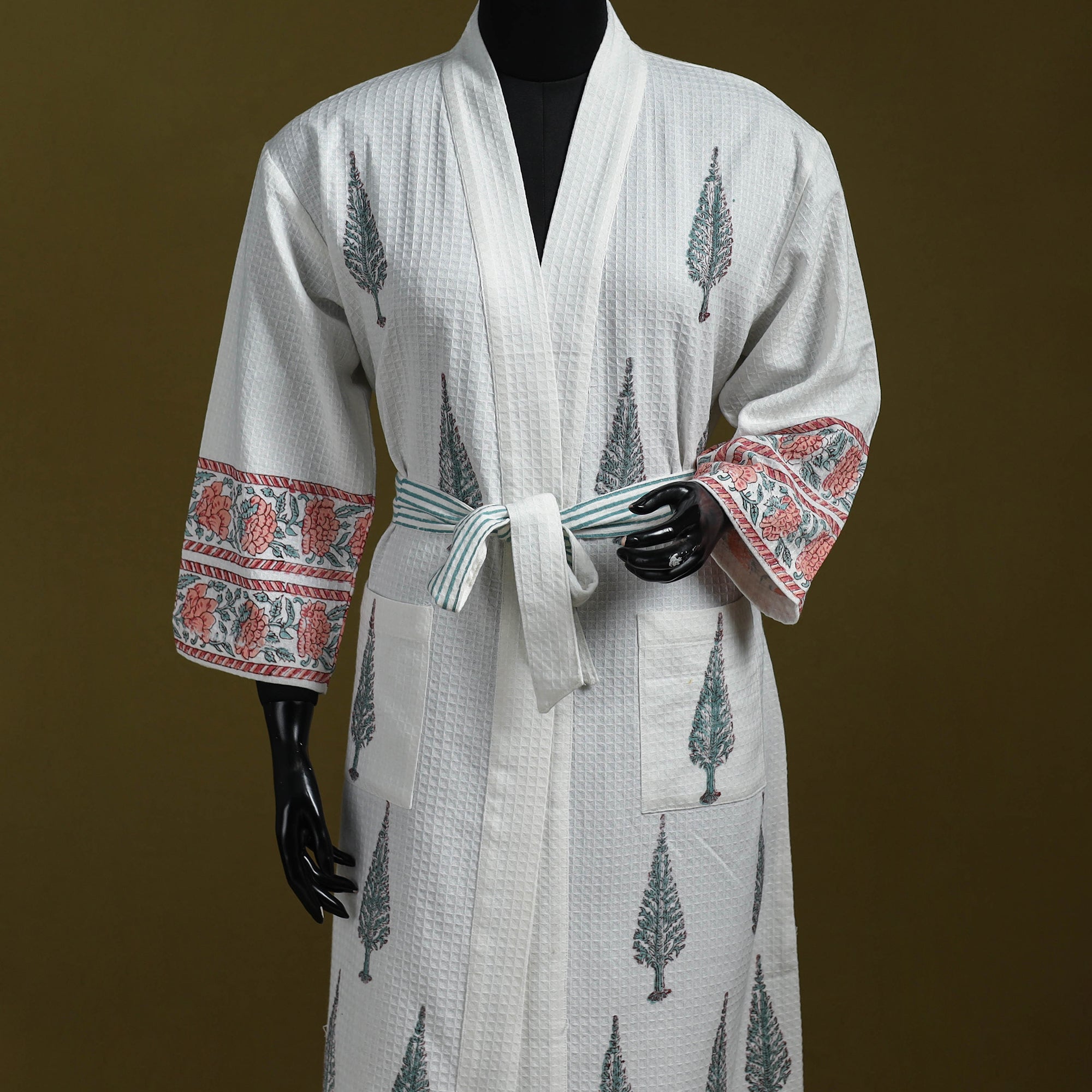 White sanganeri block print waffle weave bath robe is crafted in Rajasthan by artisans Ashok Kumar Chhipa and Lalit Kishore Chhipa using handwoven cotton with a 6-shaft weave for better absorbency. It features vibrant VAT-dyed prints two side pockets for convenience and a separate belt for a comfortable fit. Lightweight breathable and easy to wear it is ideal for showers, spa days or relaxing mornings.