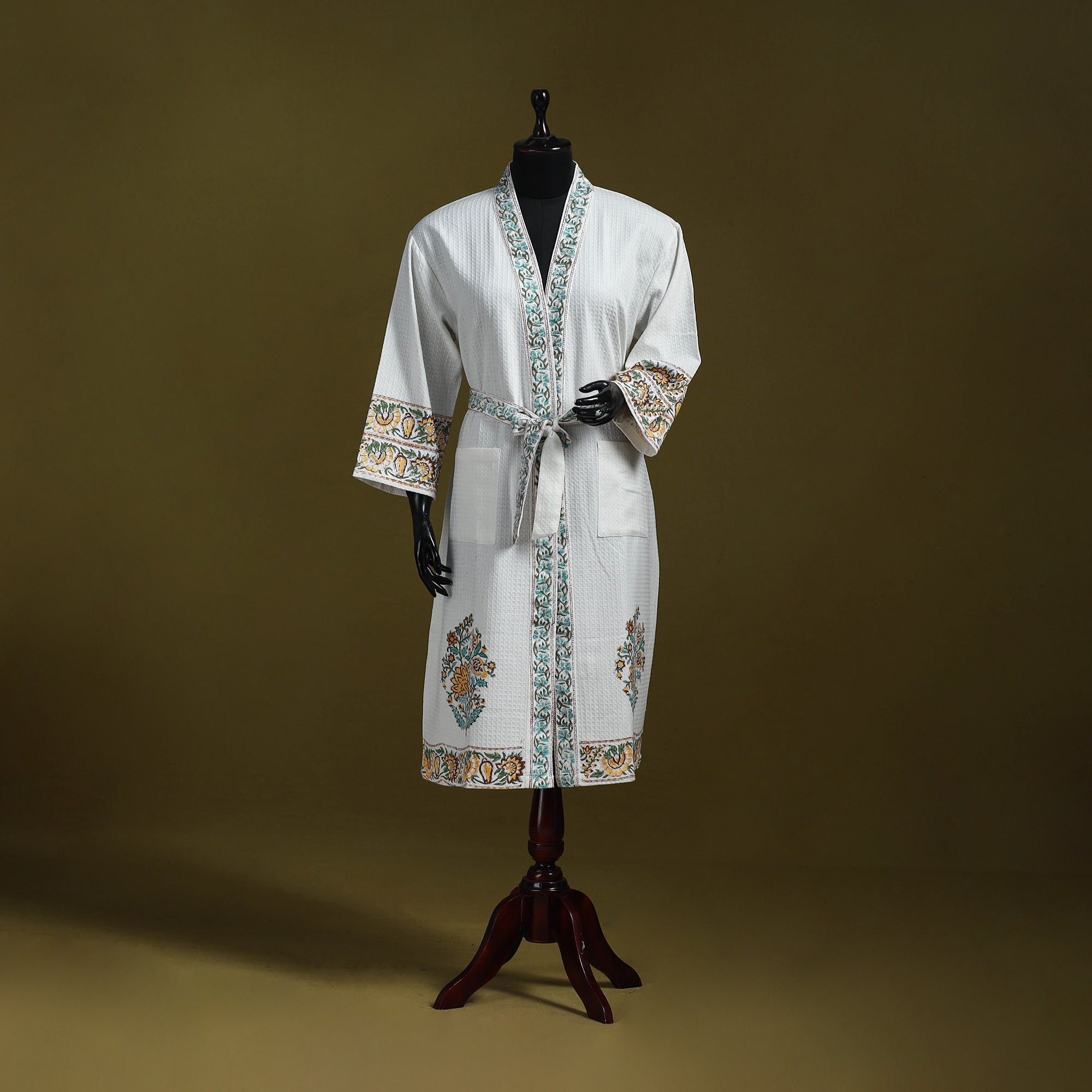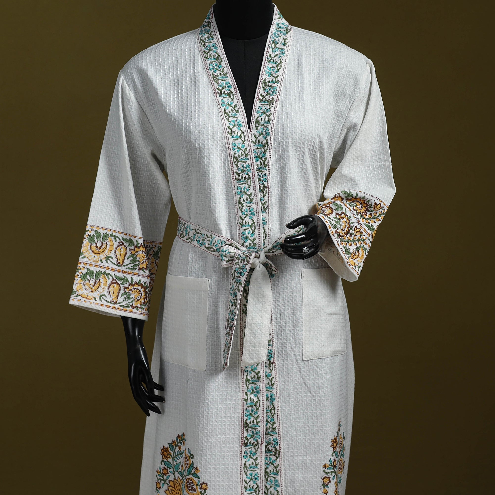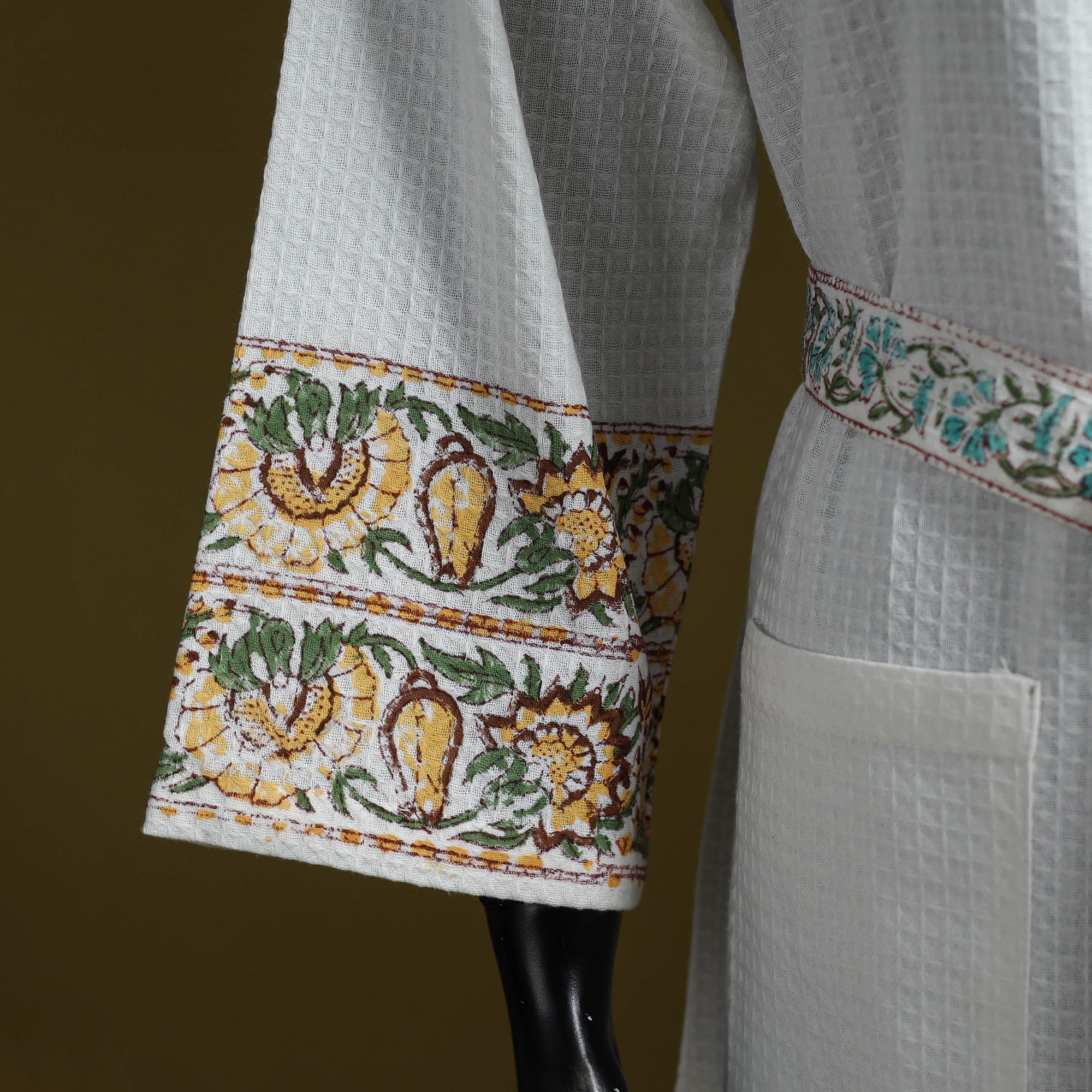 White sanganeri block print waffle weave bath robe is crafted in Rajasthan by artisans Ashok Kumar Chhipa and Lalit Kishore Chhipa using handwoven cotton with a 6-shaft weave for better absorbency. It features vibrant VAT-dyed prints two side pockets for convenience and a separate belt for a comfortable fit. Lightweight breathable and easy to wear it is ideal for showers, spa days or relaxing mornings.