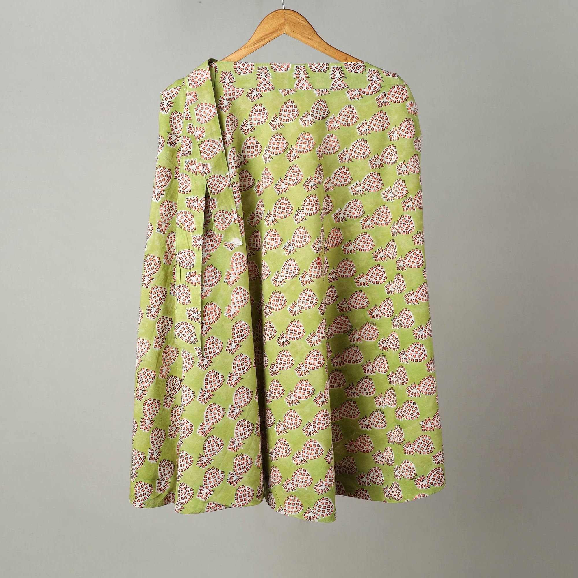 Celebrate the vibrant artistry of Rajasthan with this green sanganeri block printed cotton wrap around skirt. Made from cotton, this skirt features intricate block prints created using traditional Sanganeri techniques. With a comfortable waist tie-up closure, it’s perfect for everyday wear or special occasions.