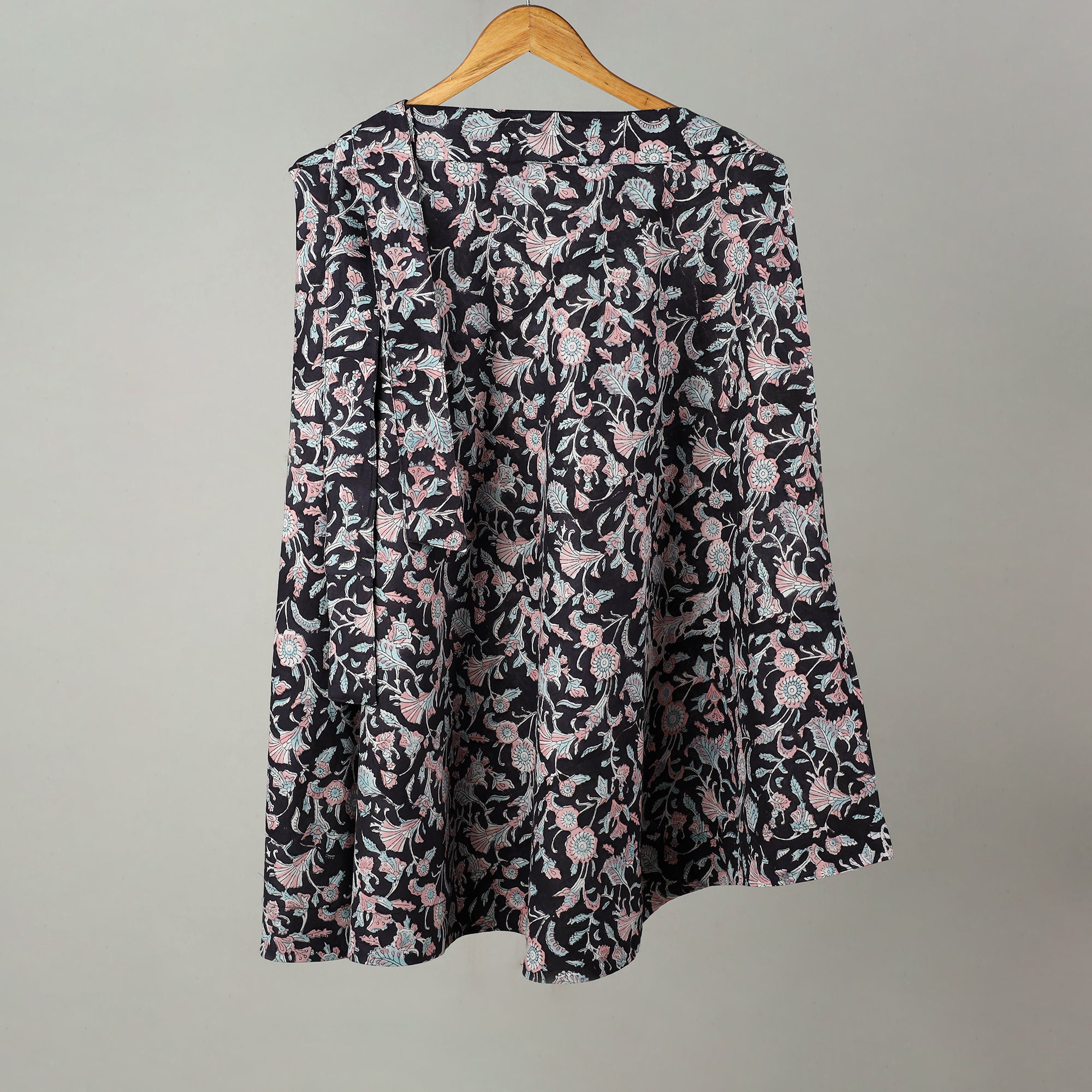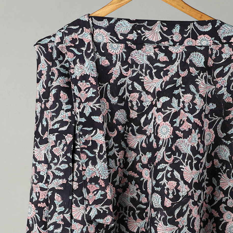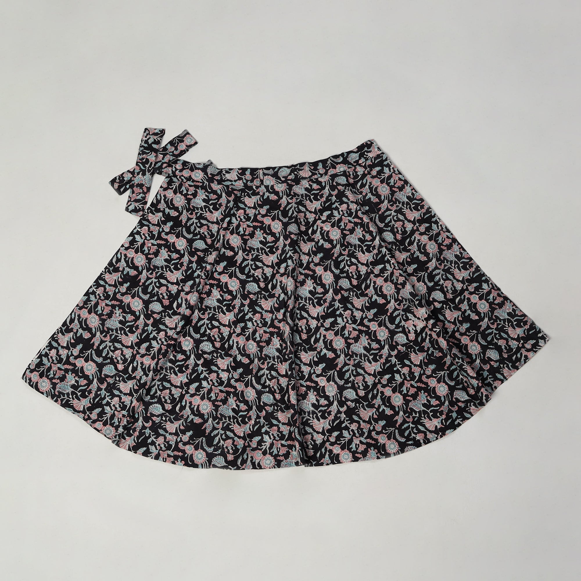 Celebrate the vibrant artistry of Rajasthan with this black sanganeri block printed cotton wrap around skirt. Made from cotton, this skirt features intricate block prints created using traditional Sanganeri techniques. With a comfortable waist tie-up closure, it’s perfect for everyday wear or special occasions.