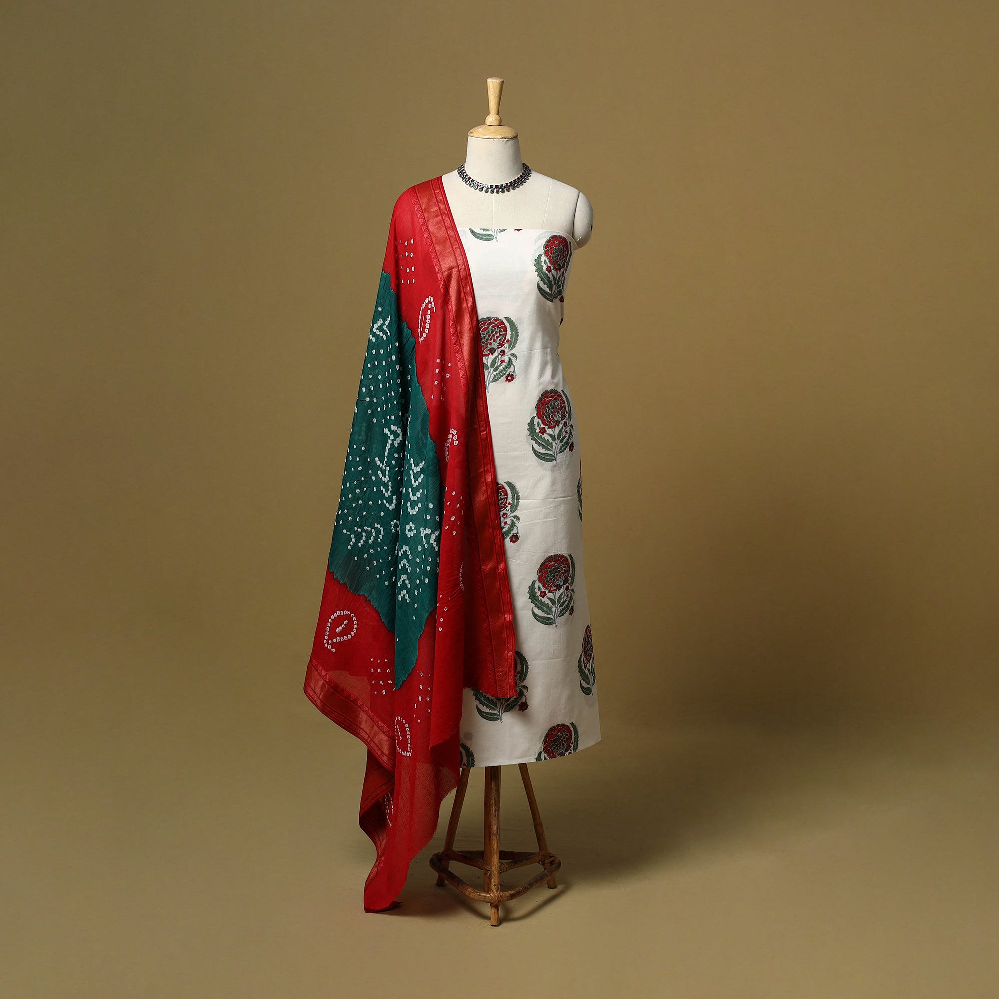 Sanganeri hand block print cotton 2pc unstitched dress material is crafted using the traditional hand block printing technique of Sanganer, a town in the southern part of Jaipur, Rajasthan. This printing technique is over 500 years old and is practiced by skilled artisans. It features fine floral patterns created using hand-carved wooden blocks and bleed-free VAT dyes. Paired with a bandhani tie-dye dupatta, this set also comes with a handcrafted matching earrings to complete your look, making it suitable for family gatherings, traditional events or special occasions.