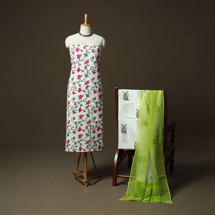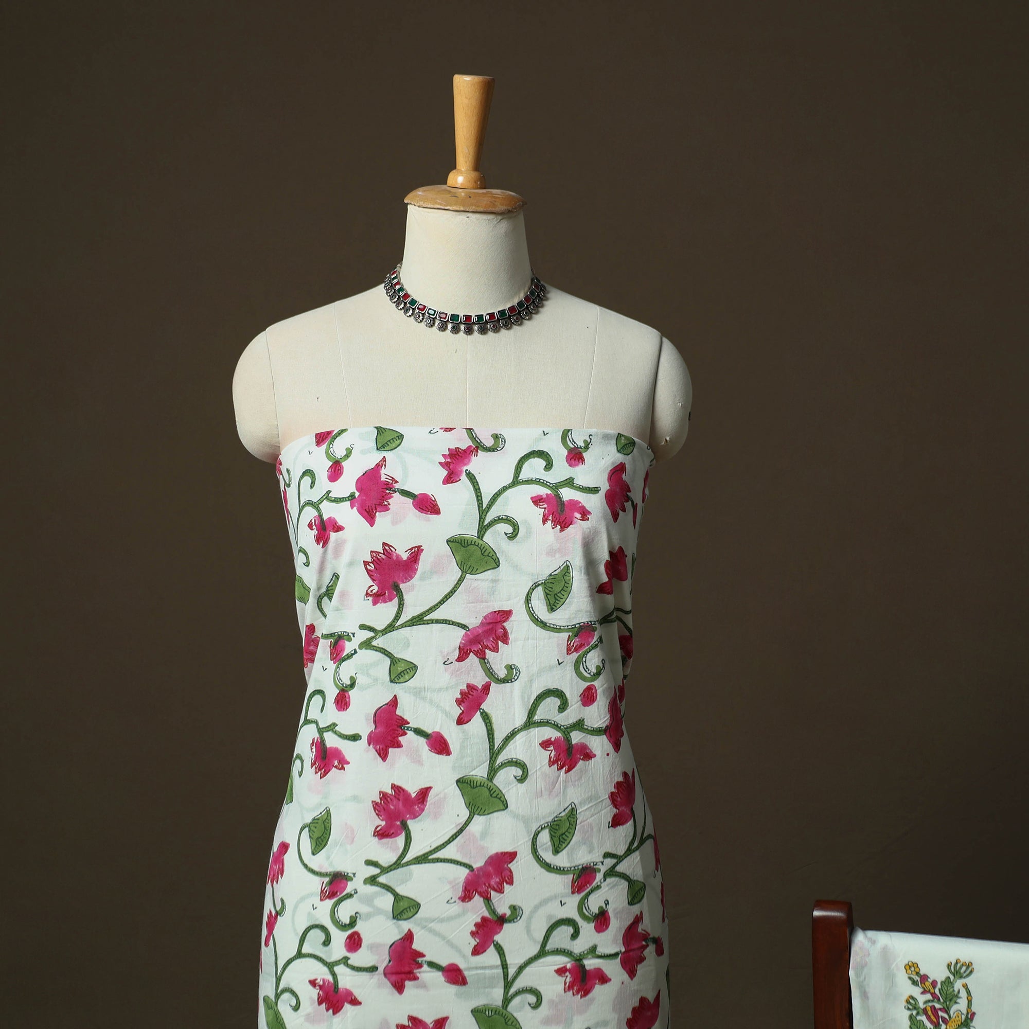 | Material | Sanganeri Hand block print cotton 3pc unstitched dress material suit set blends traditional artistry with everyday comfort. It is created using the traditional hand block printing technique of Sanganer, a historic town in the southern part of Jaipur, Rajasthan. Practised for over 500 years, this craft is carried forward by skilled artisans, with techniques passed down through generations. Fine patterns are produced using intricately hand-carved wooden blocks. The kurta and bottom fabrics are made from pure cotton. The dupatta is crafted in kota doria cotton. Kota Doria is an age-old Indian textile produced in the Kota district of Rajasthan. The doria or threads, are finely interwoven to create signature check patterns. Its lightweight and sheer texture give it an exquisite grace and elegance of its own. Together, this combination makes the set suitable for daily wear, workdays and gatherings. |