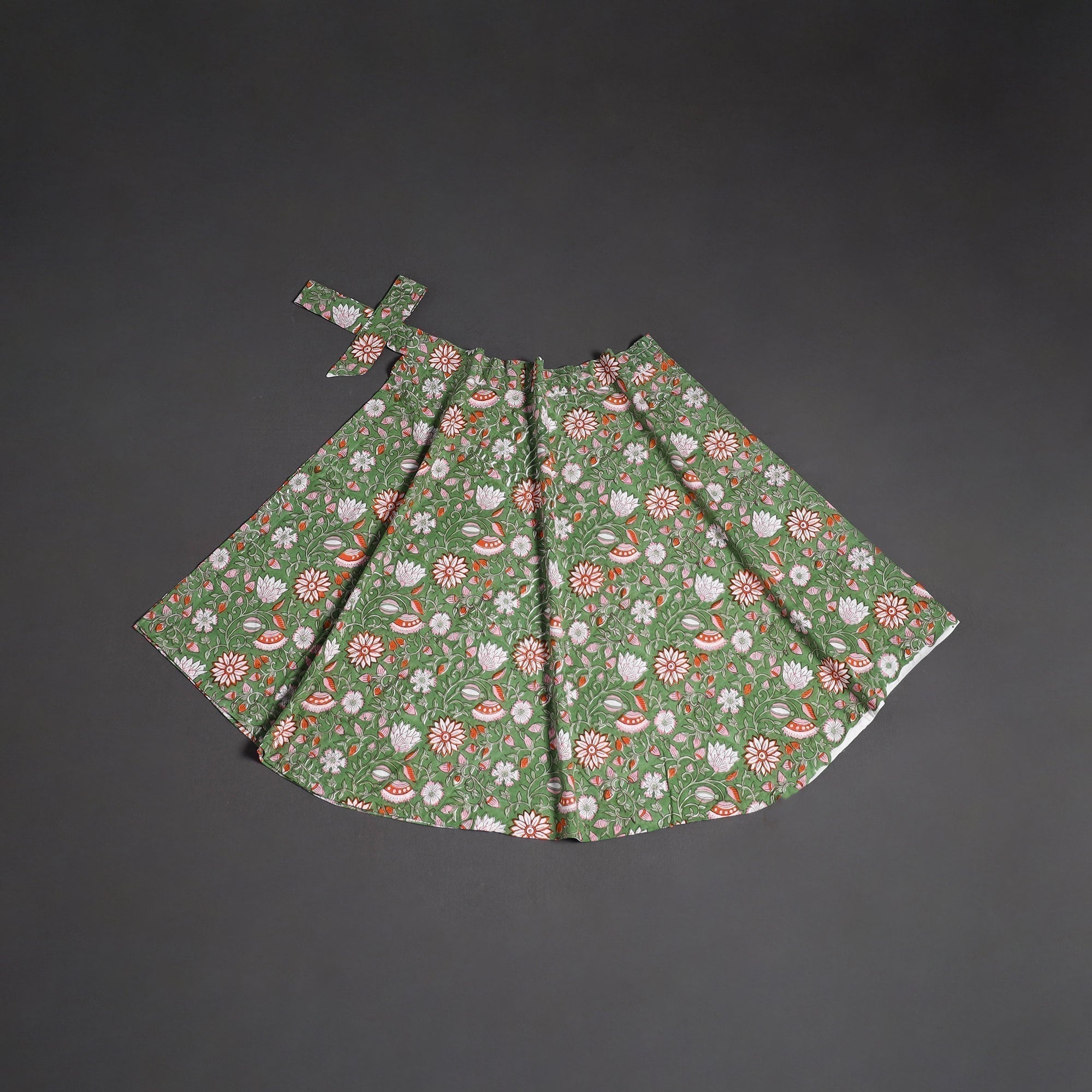 Green sanganeri hand block print cotton wrap-around skirt for women's, featuring an easy tie-up waist closure for a comfortable, adjustable fit. This centuries-old block printing technique has been practiced for over 500 years and is known for its fine detailing and delicate floral motifs. The designs are printed using traditional hand-carved wooden blocks and bleed-free VAT dyes. The wrap style makes it effortless to wear and flattering for all body types. Perfect for daily wear, vacations or relaxed outings.
