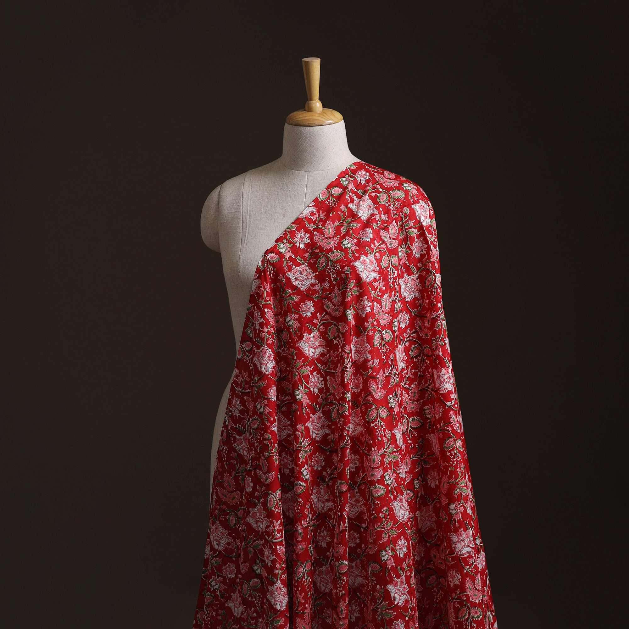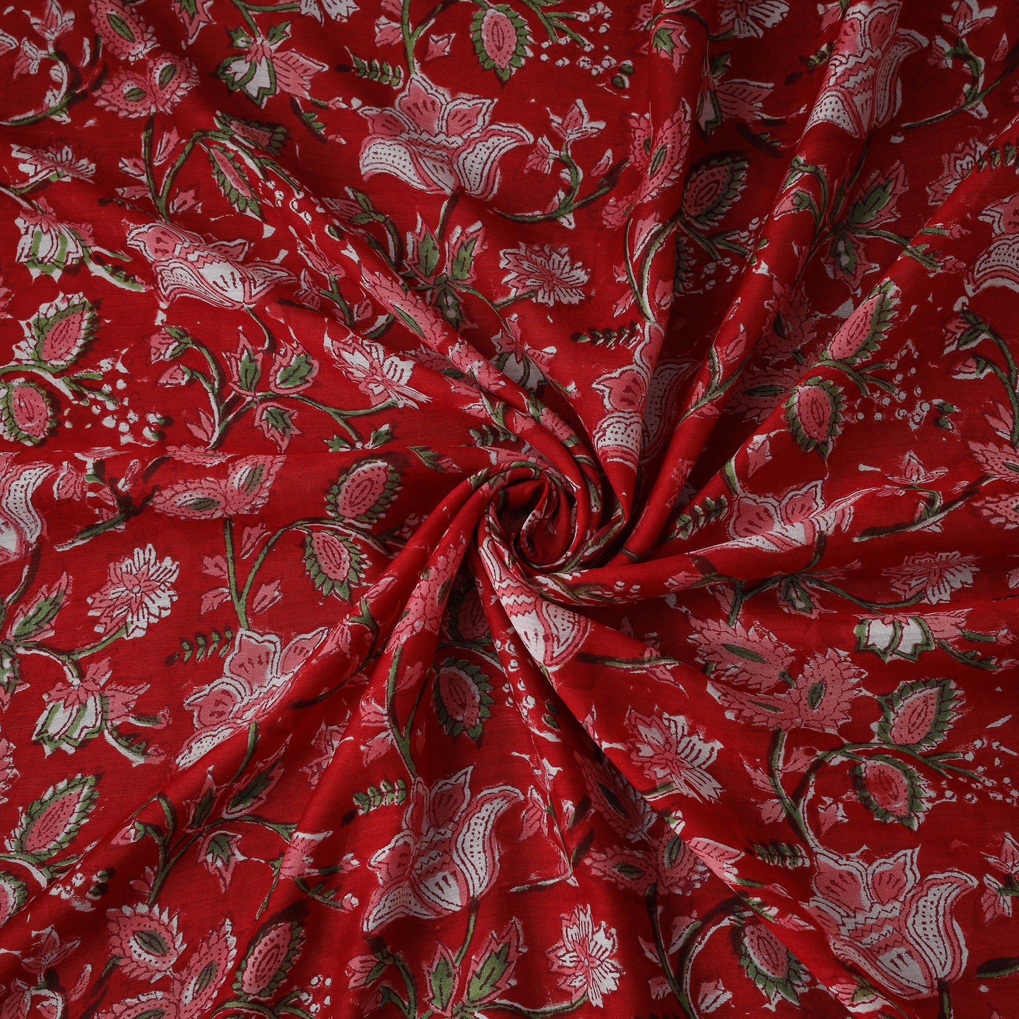 Sanganeri hand block print modal silk fabric with floral motifs and carved block detailing.