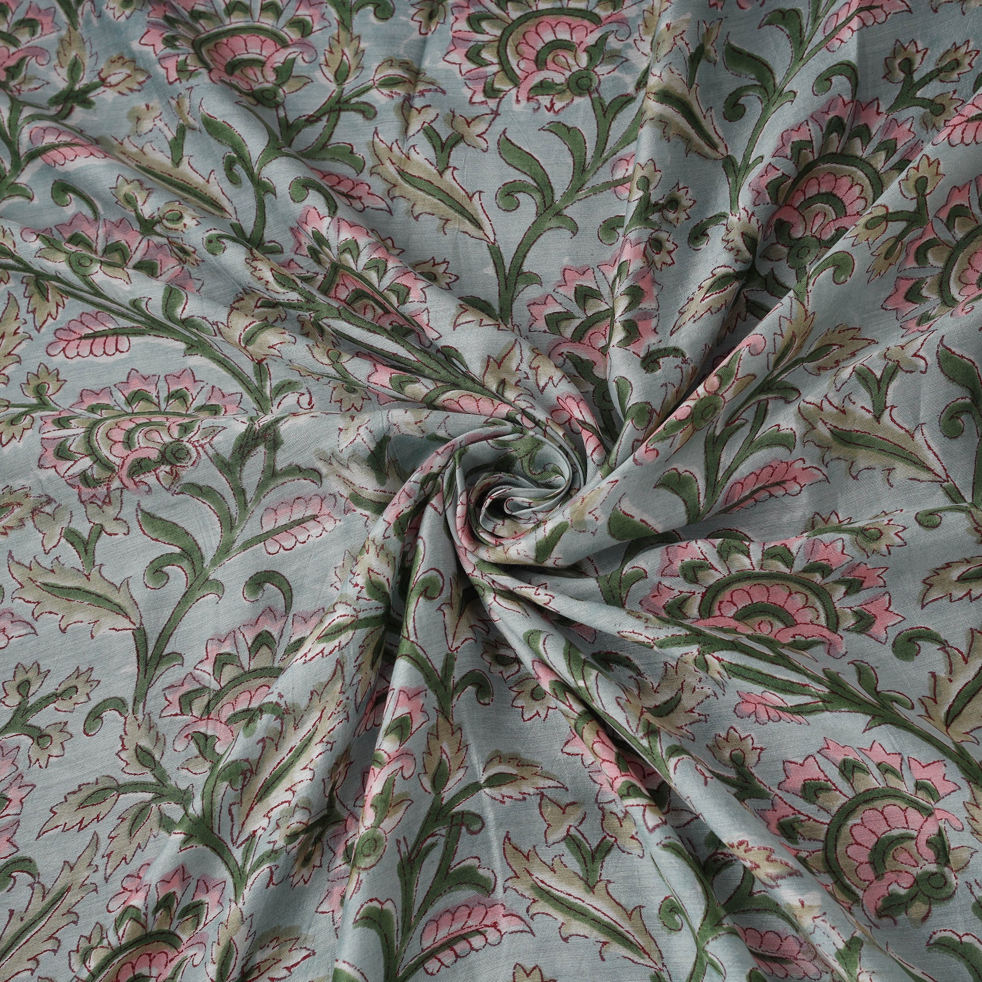 Sanganeri hand block print modal silk fabric with floral motifs and carved block detailing.