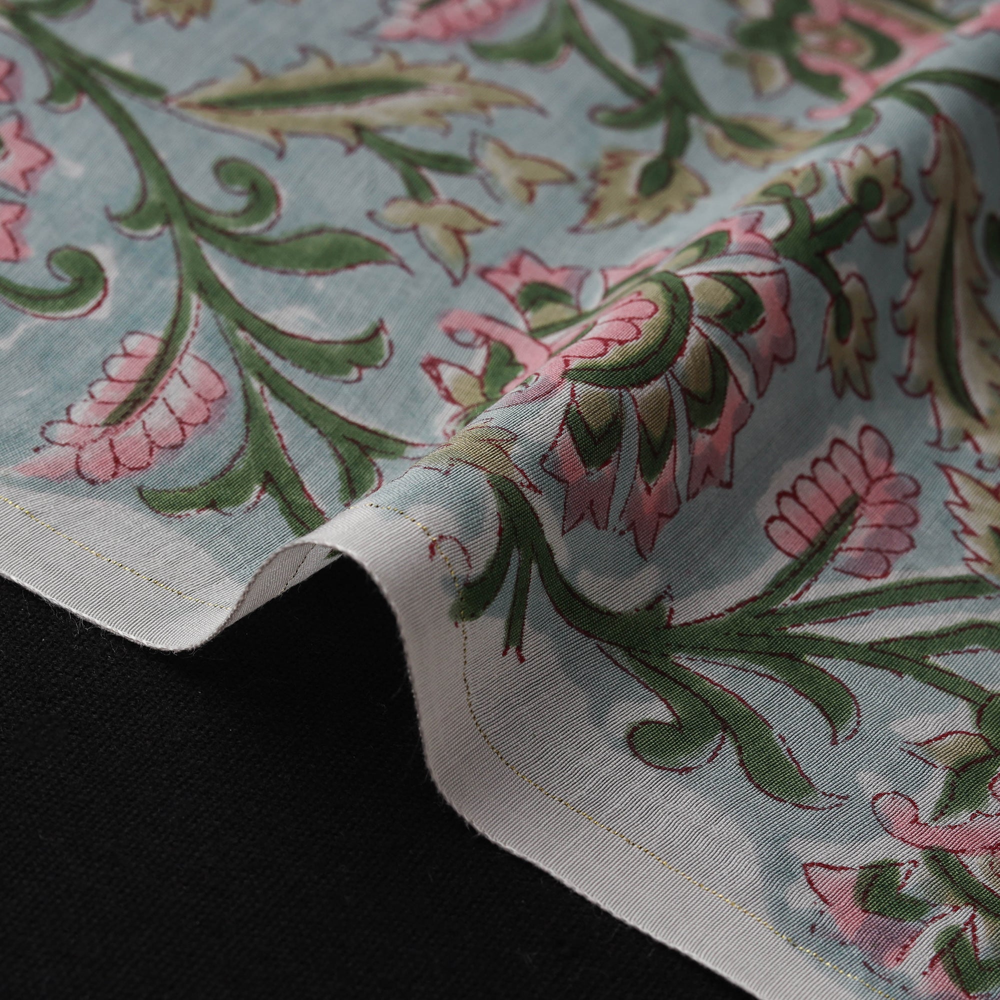 Sanganeri hand block print fabric is crafted from modal silk. The fabric is handcrafted by skilled artisans using age-old hand block printing techniques from Sanganer, a town in the southern part of Jaipur, Rajasthan. It features delicate floral designs inspired by roses, lotus, lilies and sunflowers. The designs are created using hand-carved wooden blocks and bleed-free VAT dyes. Versatile and rooted in tradition, this hand block print fabric beautifully blends authenticity with conscious living. Perfect for kurtas, dresses, tunics and home décor pieces like cushion covers and curtains.