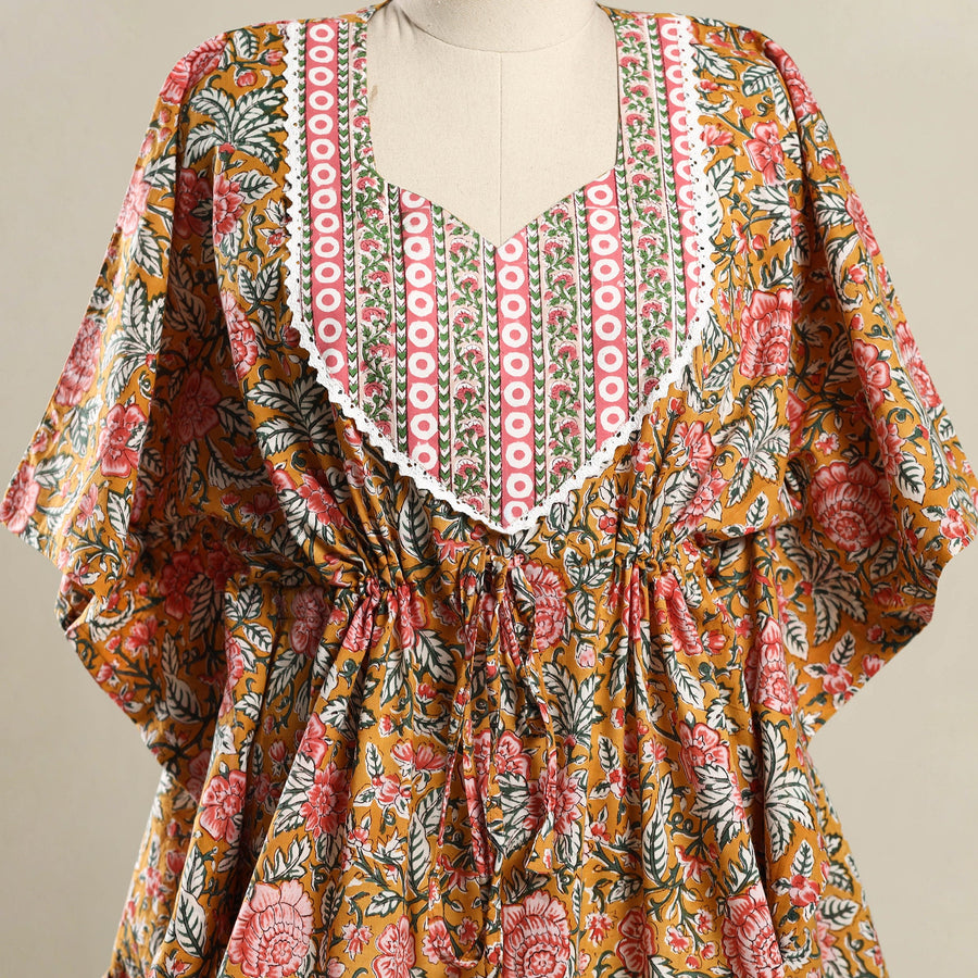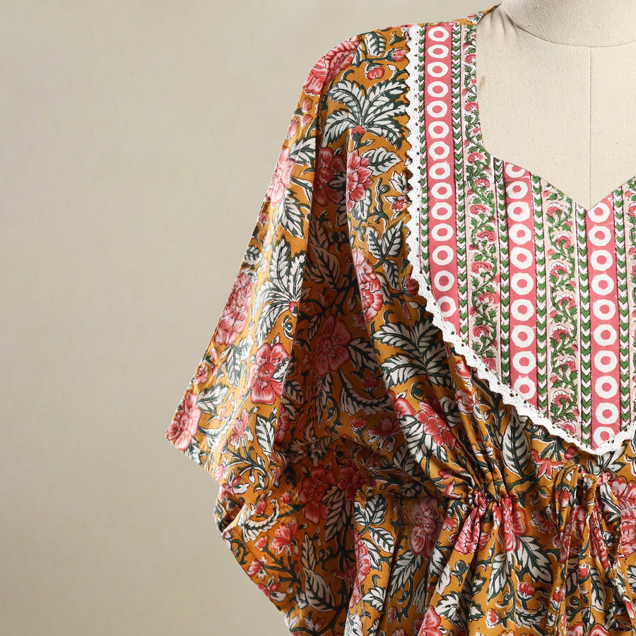 Stay comfy and stylish in this orange sanganeri hand block print mosaic fusion cotton kaftan. the short loose fitting design features with long flowing sleeves offering comfort. The drawstring waist tie allows you to customize the fit to your shape. Perfect for casual outings beach days or lounging at home this kaftan adds a traditional yet fashionable touch to your wardrobe.