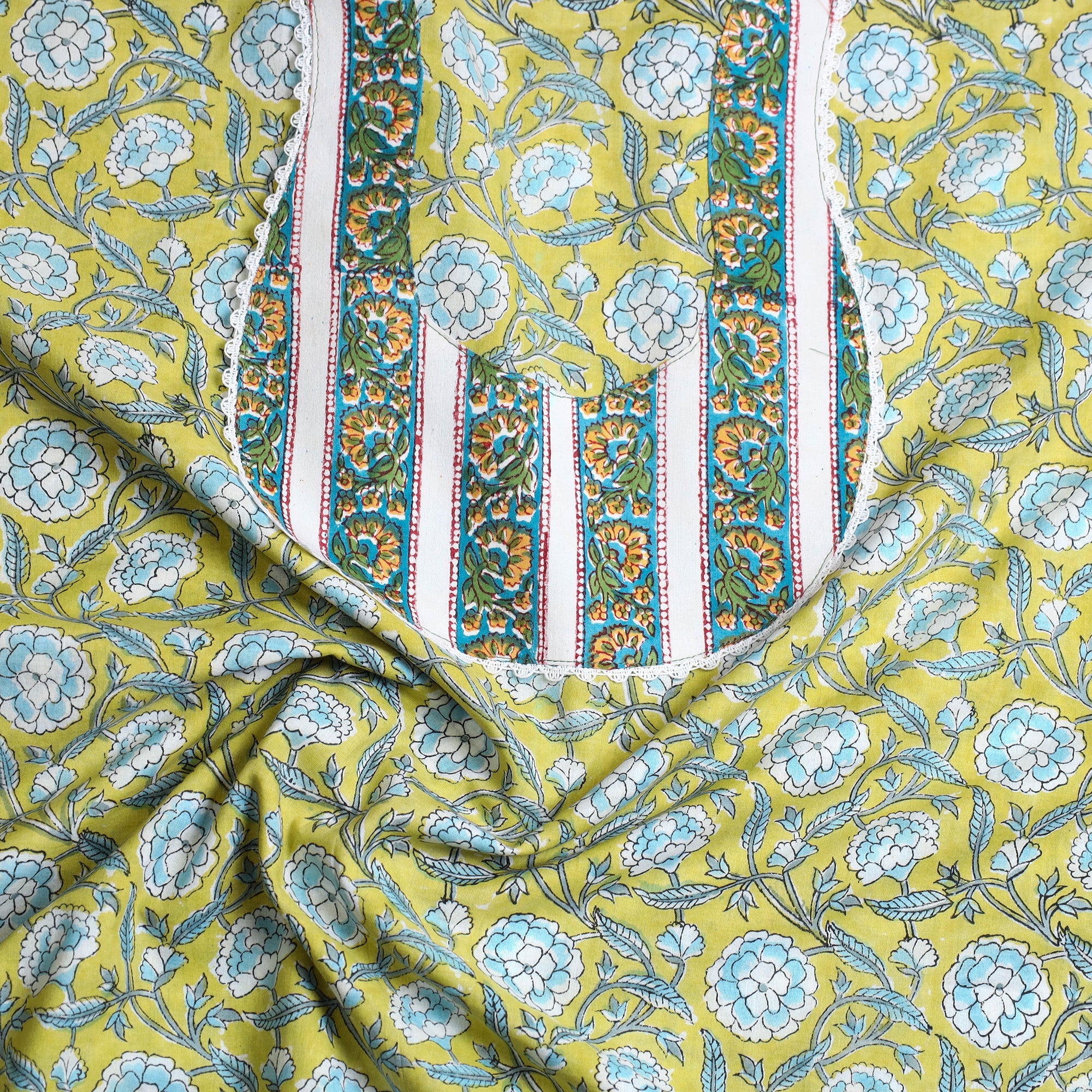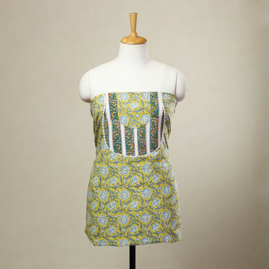 This green sanganeri print patchwork cotton kurta material showcases intricate block printed method. Made from soft, breathable cotton, it features vibrant, detailed patterns inspired by India’s rich cultural heritage. Ideal for creating custom kurtas, this fabric offers both comfort and elegance.
