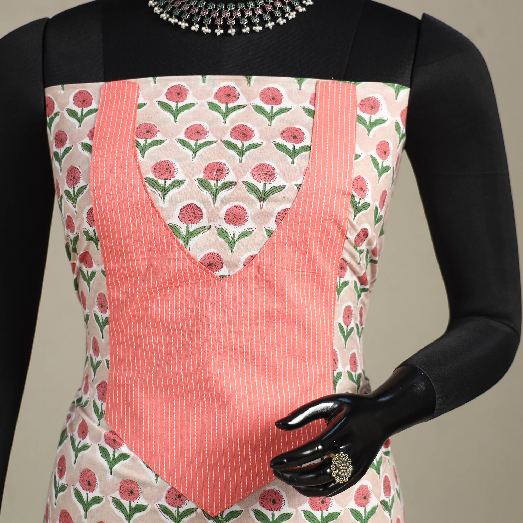 This beige sanganeri print patchwork cotton kurta material features vibrant designs created using the traditional block printing technique originating from Sanganer, Rajasthan. Soft and breathable, it’s perfect for custom kurtas, offering both comfort and cultural style.