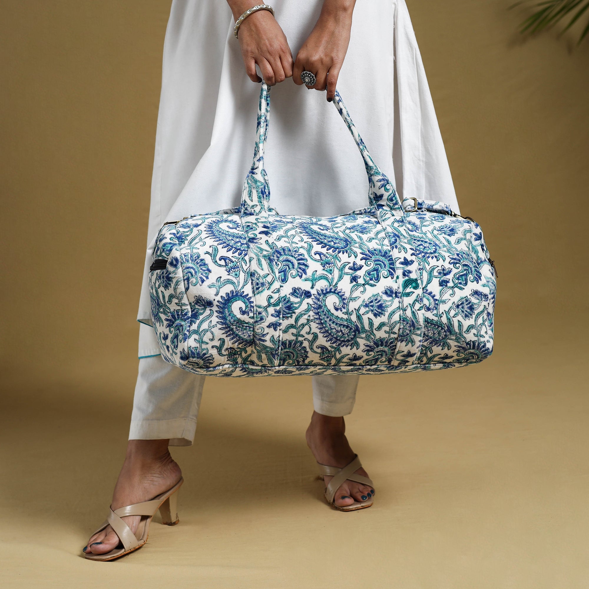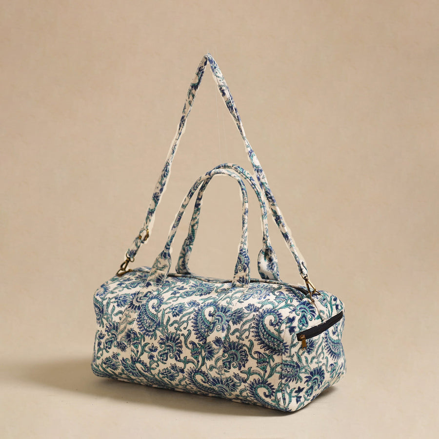 | Material | Sanganeri print velvet travel duffle bag. Crafted using traditional sanganeri block printing techniques, they combine functionality and artistry. It has one zipper pocket inside and two pocket outside and ample space to keep most of your essentials. A must-have for wanderlust souls, this duffle bag is perfect for adventurous getaways or weekend escapes. |