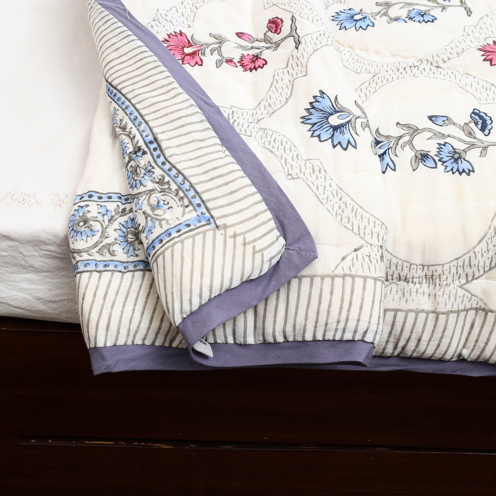 Wrap yourself in the warmth of heritage with our sanganeri reversible single soft cotton quilt/blanket. Handcrafted in Jaipur using the timeless sanganeri hand-block printing technique this reversible quilt combines art with functionality. Azo-free dyes ensure its eco-friendly and safe for your family. Perfect for cold nights, its lightness and breathability make it versatile for year round use.