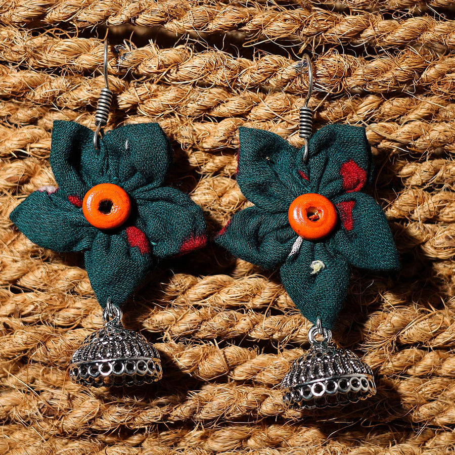 Enhance your style with our green handcrafted gs fabart phool kali earrings. Intricately designed with fabric & german silver known for its shiny finish. Perfect for casual outings or festive celebrations, this beautiful earrings for women add elegance to any outfit.
