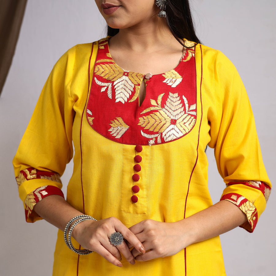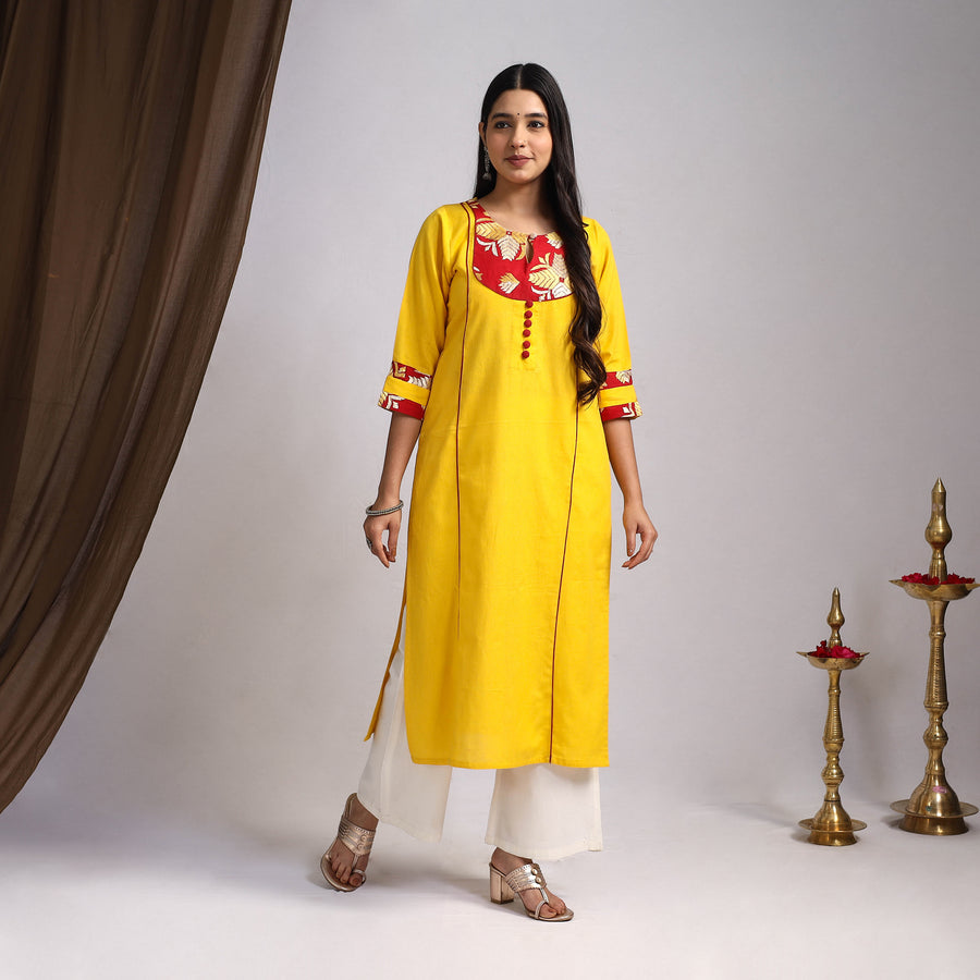 Yellow satrangi handcrafted flex cotton plain straight kurta blends tradition with contemporary elegance. The intricate patchwork detailing add a unique charm. Featuring a convenient one-side pocket, this kurta is perfect for casual outings, festive gatherings. Comfortable and stylish, its a must have for effortless ethnic fashion.