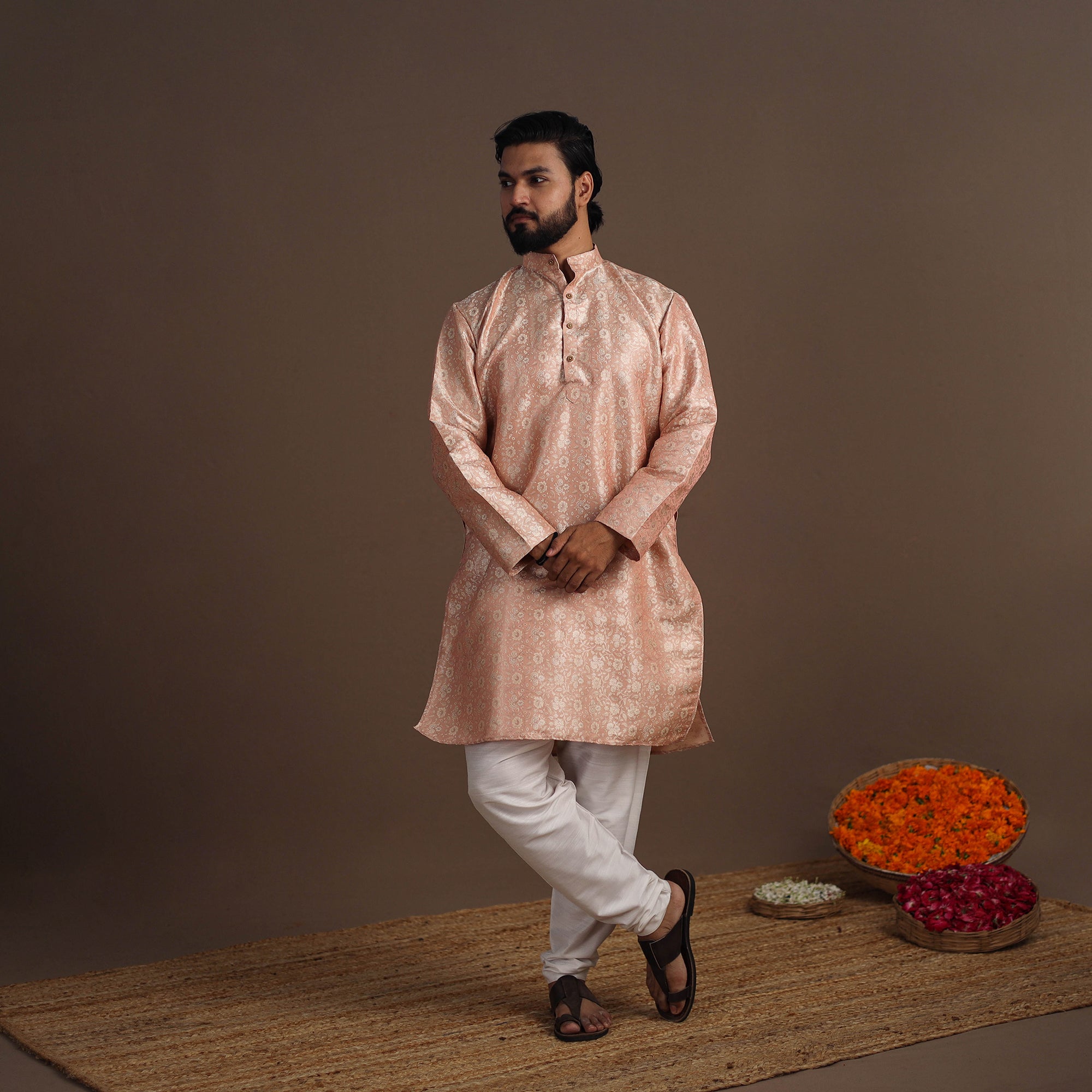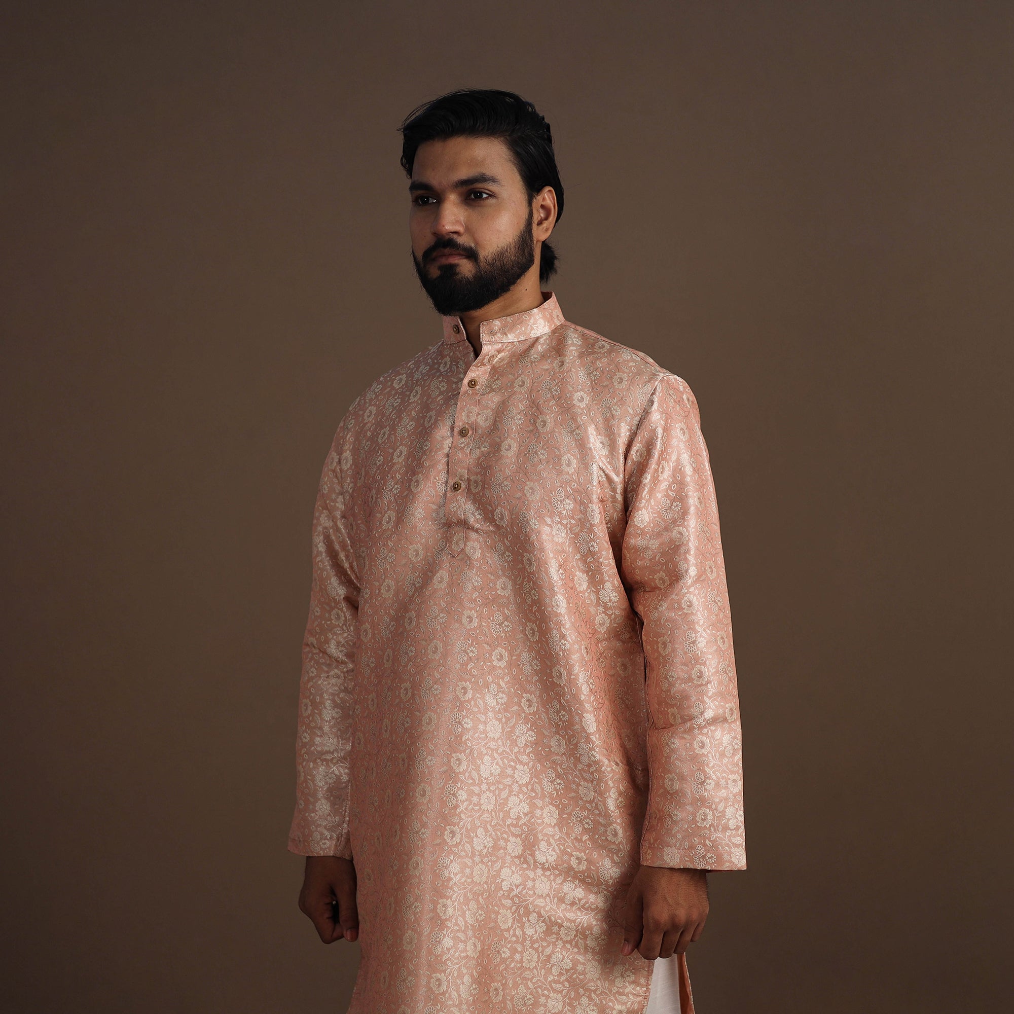Enhance your style with our peach banarasi semi silk brocade men long kurta. Made from authentic banarasi semi-silk brocade fabric, this kurta is adorned with intricate zari jaal weaving that reflects the timeless artistry of Banaras. Ideal for festive gatherings or special occasions, this kurta blends regal elegance with everyday comfort. It features full sleeves, a front button placket with a Chinese collar, and two side pockets convenient for your daily essentials.