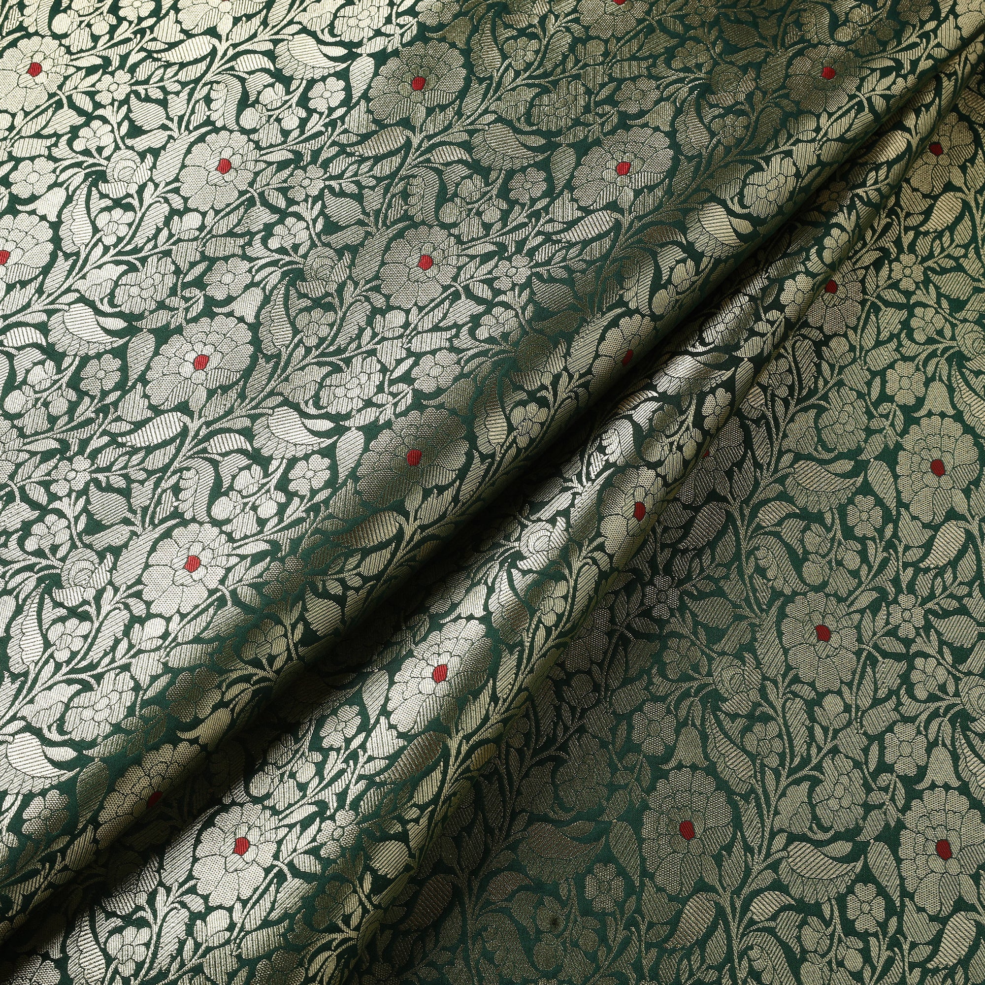Experience the elegance of green semi silk brocade banarasi fabric, adorned with intricate floral zari jaal weaving and delicate meena buti motifs. Crafted using age-old techniques passed down through generations of skilled artisans in Varanasi, this fabric embodies timeless charm and grace, making it ideal for ethnic ensembles like sarees, lehengas, or kurtas.