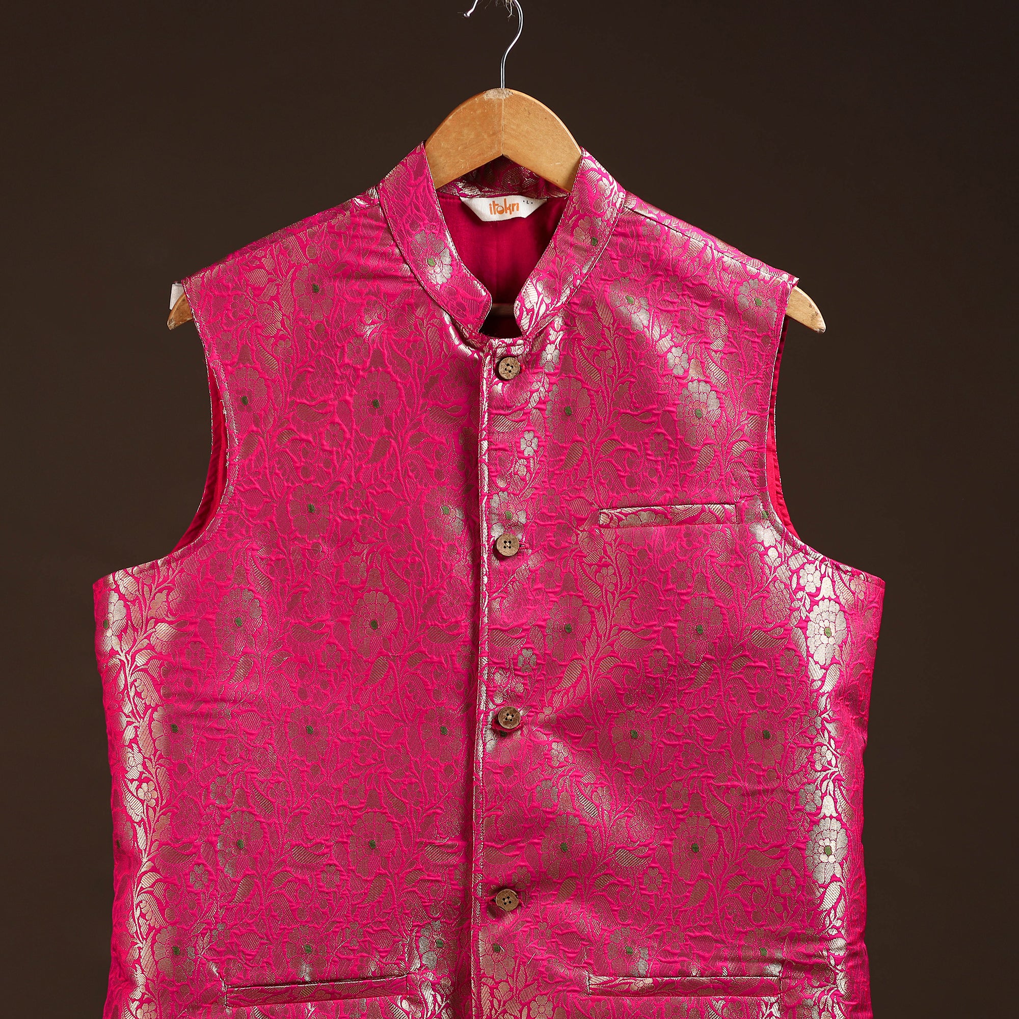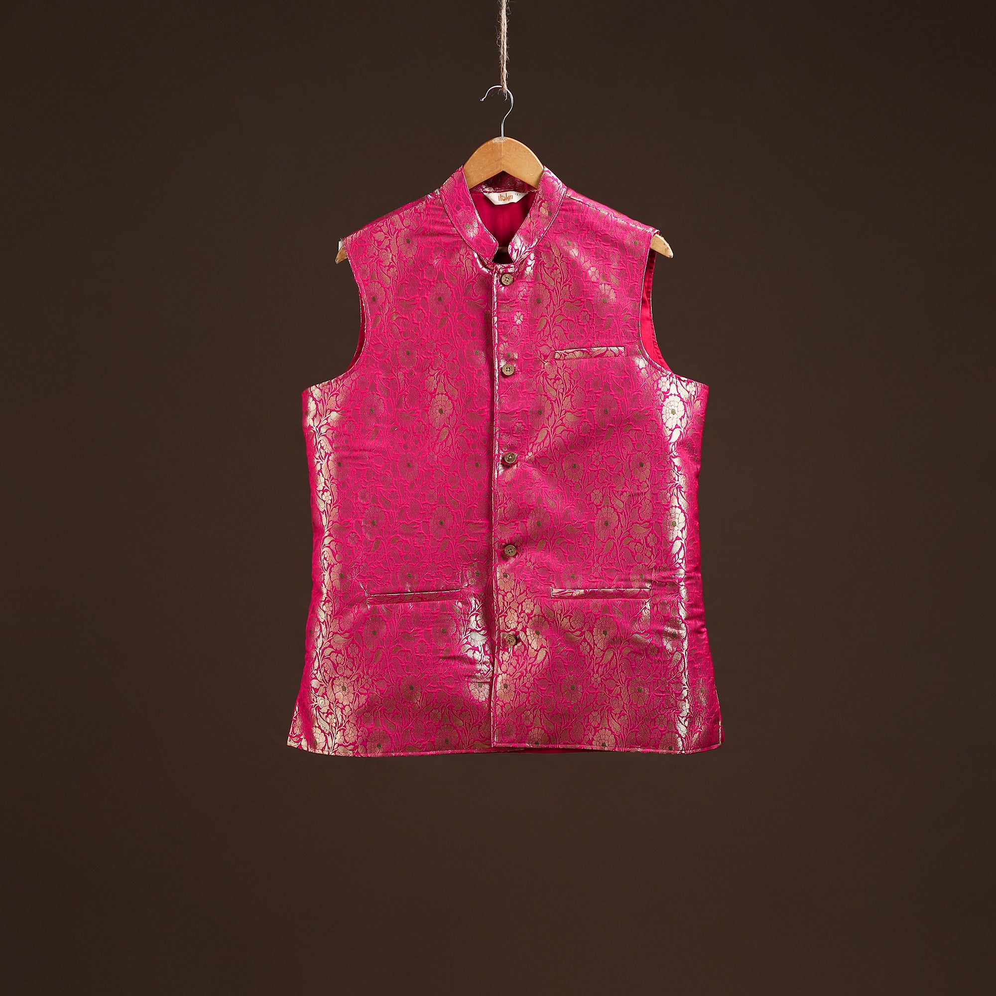 This pink semi-silk meena buti brocade banarasi nehru jacket is the perfect blend of tradition and style. Featuring a smart chinese collar, sleeveless design, and three functional outer pockets, it combines comfort with elegance. Pair it with a kurta-pajama for festive occasions, layer over a shirt and trousers for semi-formal outings, or style with denim for a trendy casual look. A versatile piece that effortlessly elevates every occasion.