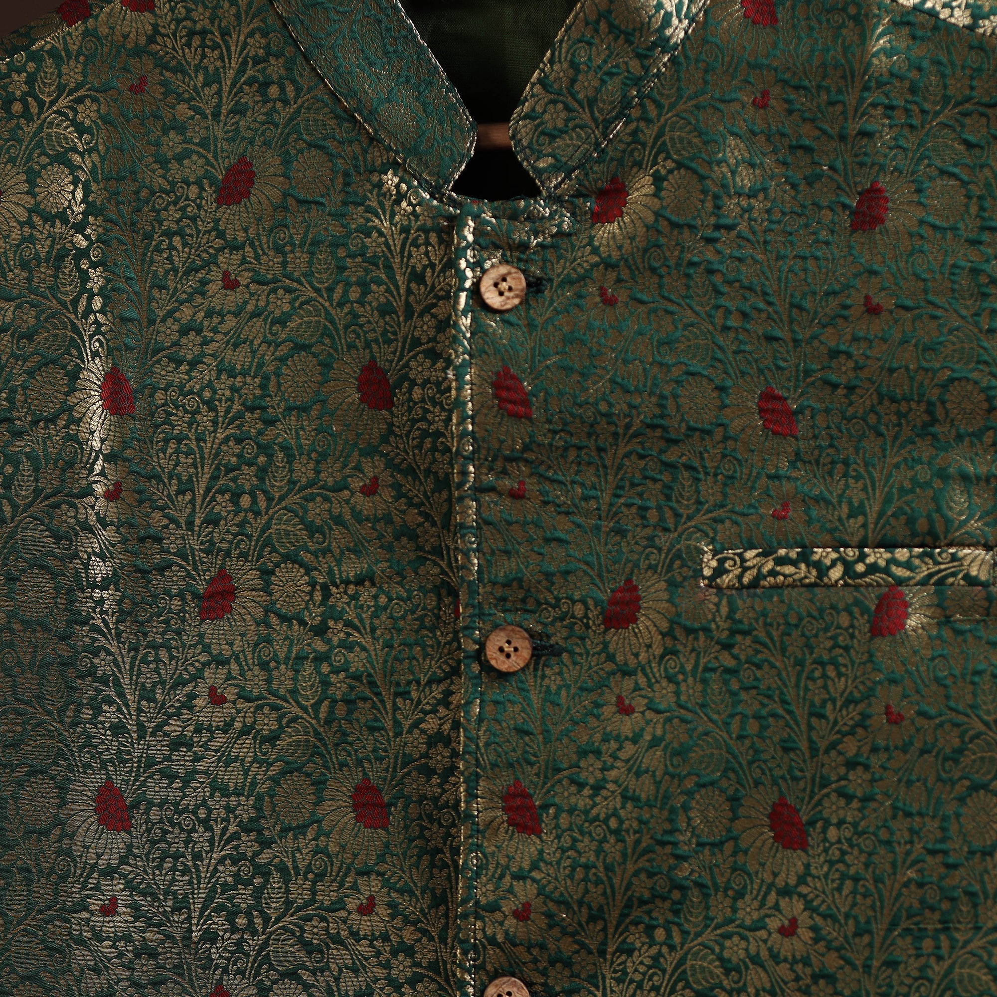 This green semi-silk meena buti brocade banarasi nehru jacket is the perfect blend of tradition and style. Featuring a smart chinese collar, sleeveless design, and three functional outer pockets, it combines comfort with elegance. Pair it with a kurta-pajama for festive occasions, layer over a shirt and trousers for semi-formal outings, or style with denim for a trendy casual look. A versatile piece that effortlessly elevates every occasion.