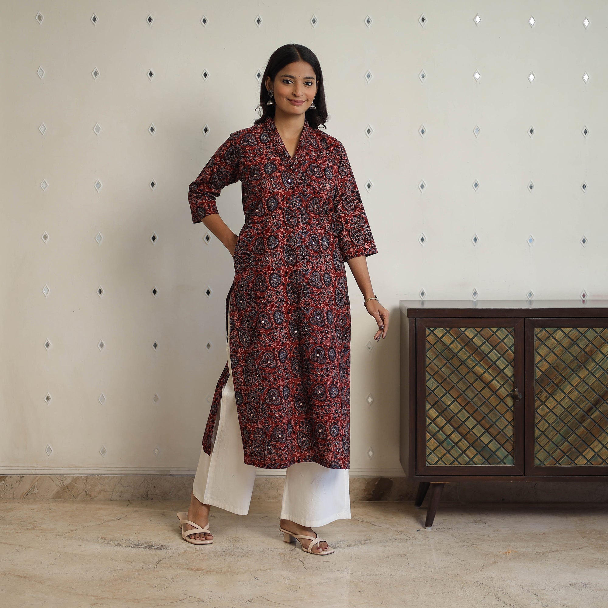 Embrace the artistry of red sequins cotton straight ajrakh print kurta. This kurta is crafted using natural dyes in the traditional ajrakh block printing technique, the kurta has one side pocket. The soft, breathable fabric ensures all-day comfort, making it perfect for casual outings or festive gatherings.