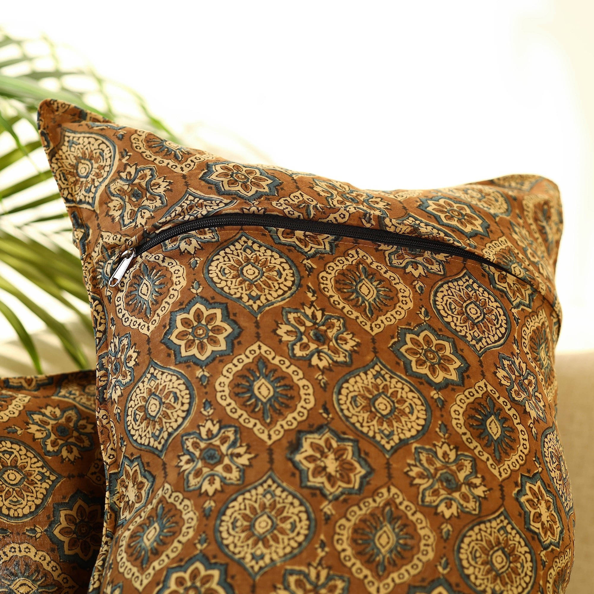 Elevate your space with this set of 2 brown ajrakh block print cotton pillow covers. Made using traditional block printing techniques, each cover showcases intricate motifs and vibrant colours. Perfect for adding a touch of artful elegance to your living room or bedroom.