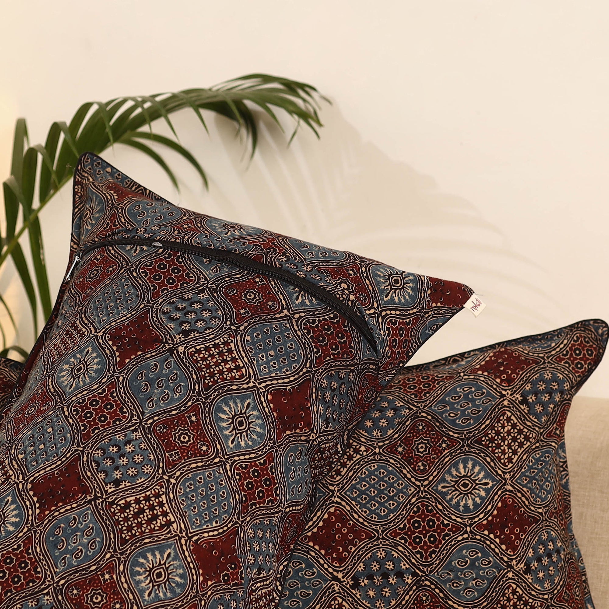 Multicolor set of 2 ajrakh hand block print pillow covers is made from pure cotton and crafted by skilled artisans using traditional techniques. Each cover features vibrant patterns inspired by Indian textile art, making them perfect for enhancing the look of your sofa, bed or lounge corner.