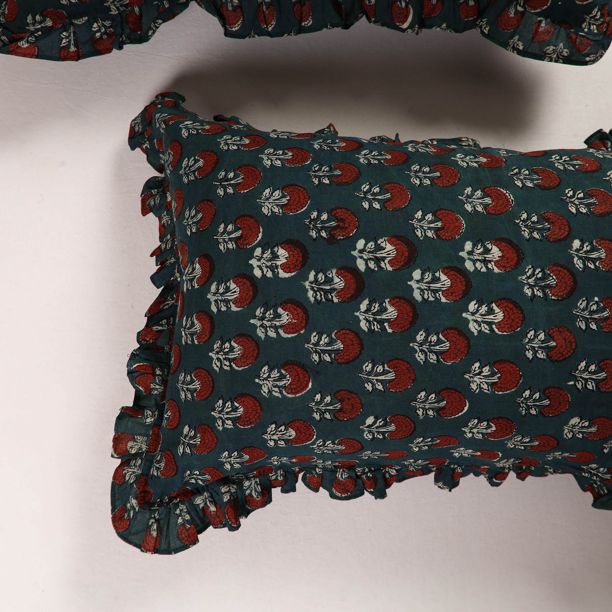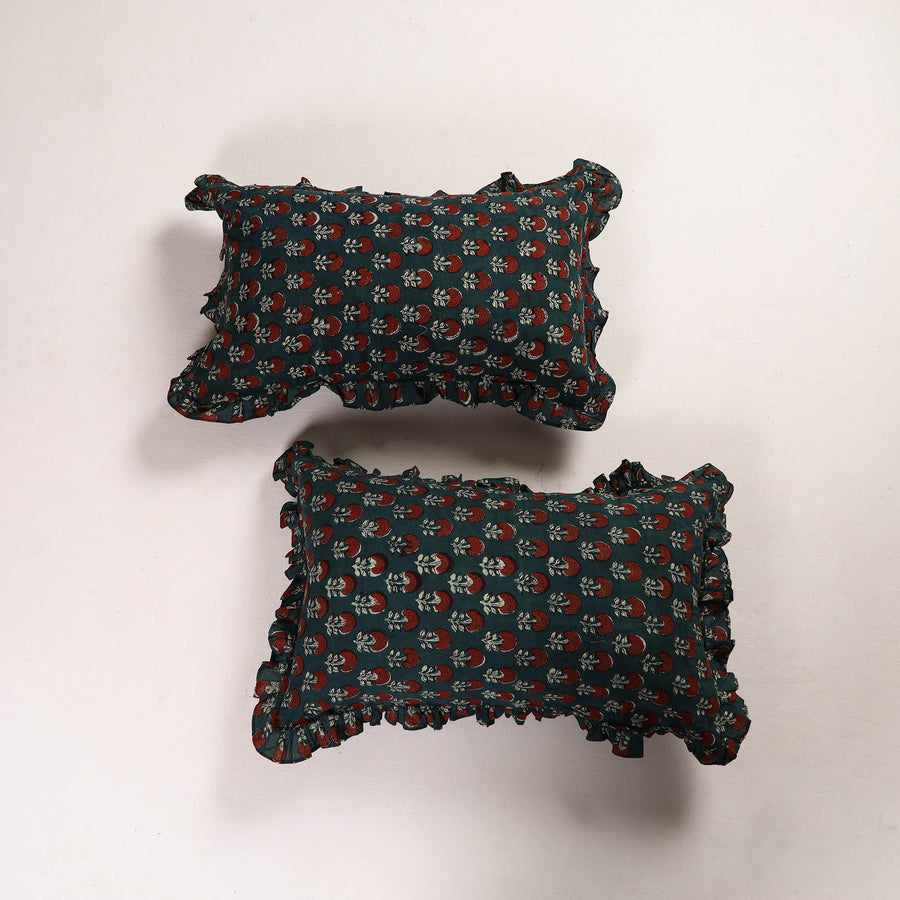 Enhance your home with our green set of 2 bagru block print cotton frill pillow covers. Made by skilled artisans, these pillow covers bring a blend of traditional craftsmanship and modern. The cotton material is both durable and eco-friendly, perfect for adding a touch of style and sustainability to your living space & bedroom.