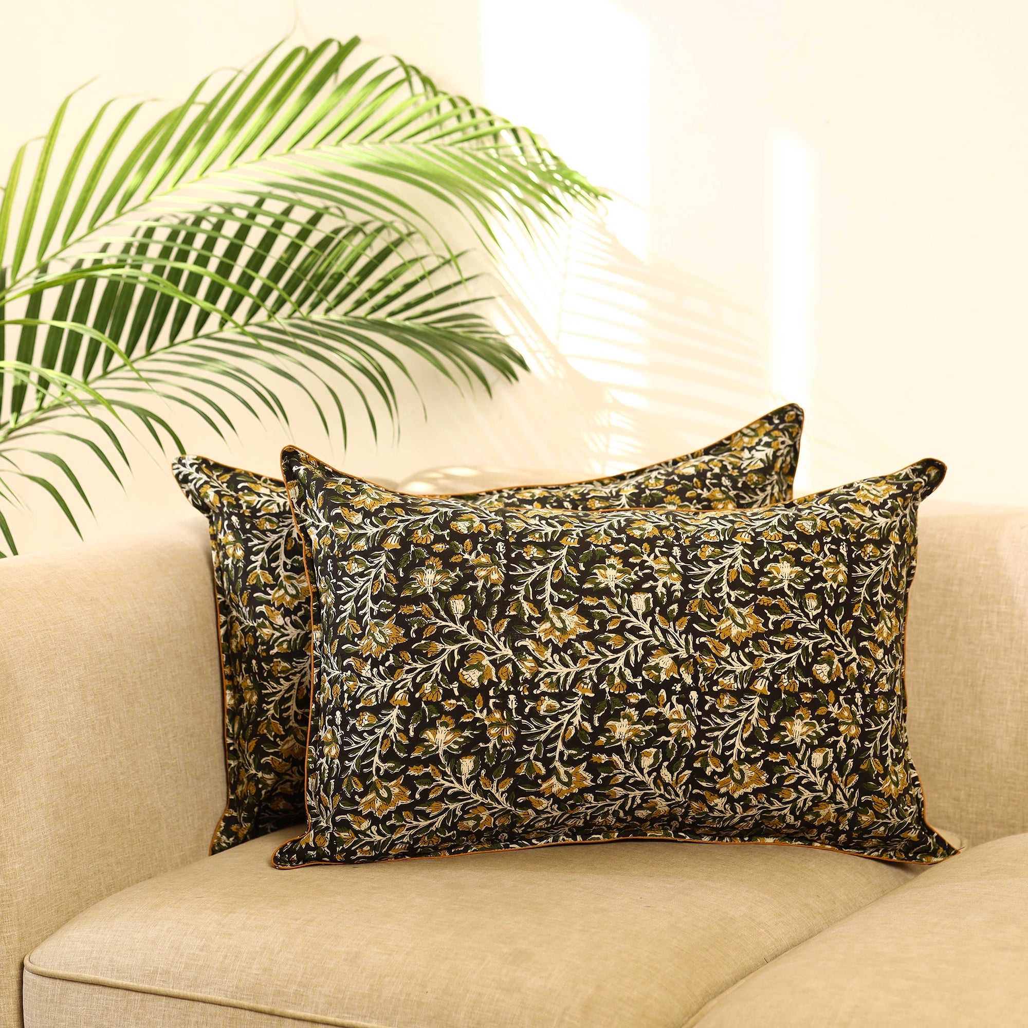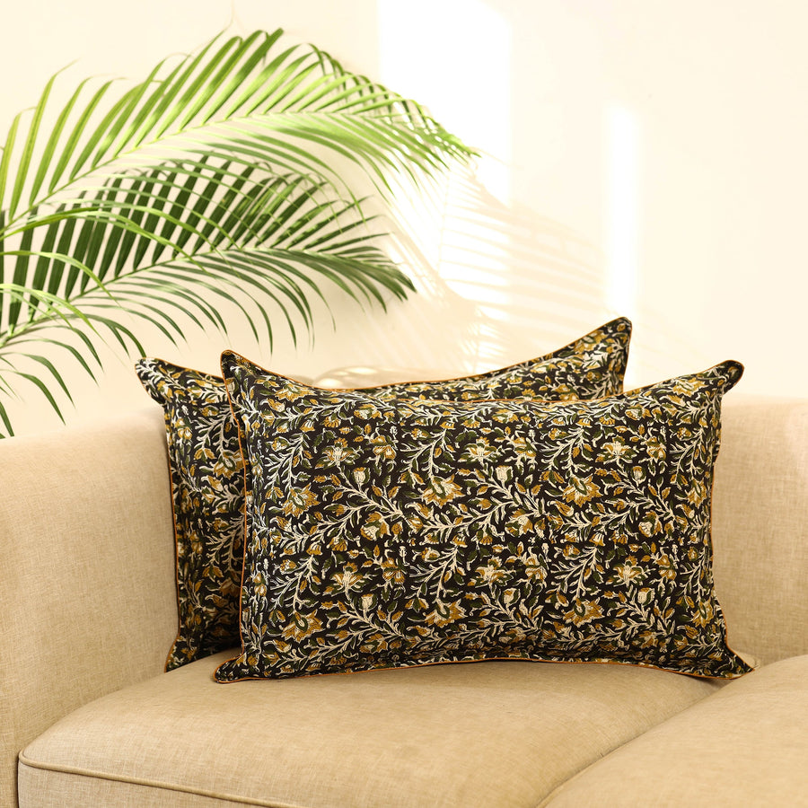 Elevate your home décor with this set of 2 black bagru block print cotton pillow covers. Handcrafted by skilled artisans, these covers beautifully blend traditional craftsmanship with a modern aesthetic. The cotton fabric is durable and eco-friendly perfect for adding a stylish and sustainable touch to your living space or bedroom.