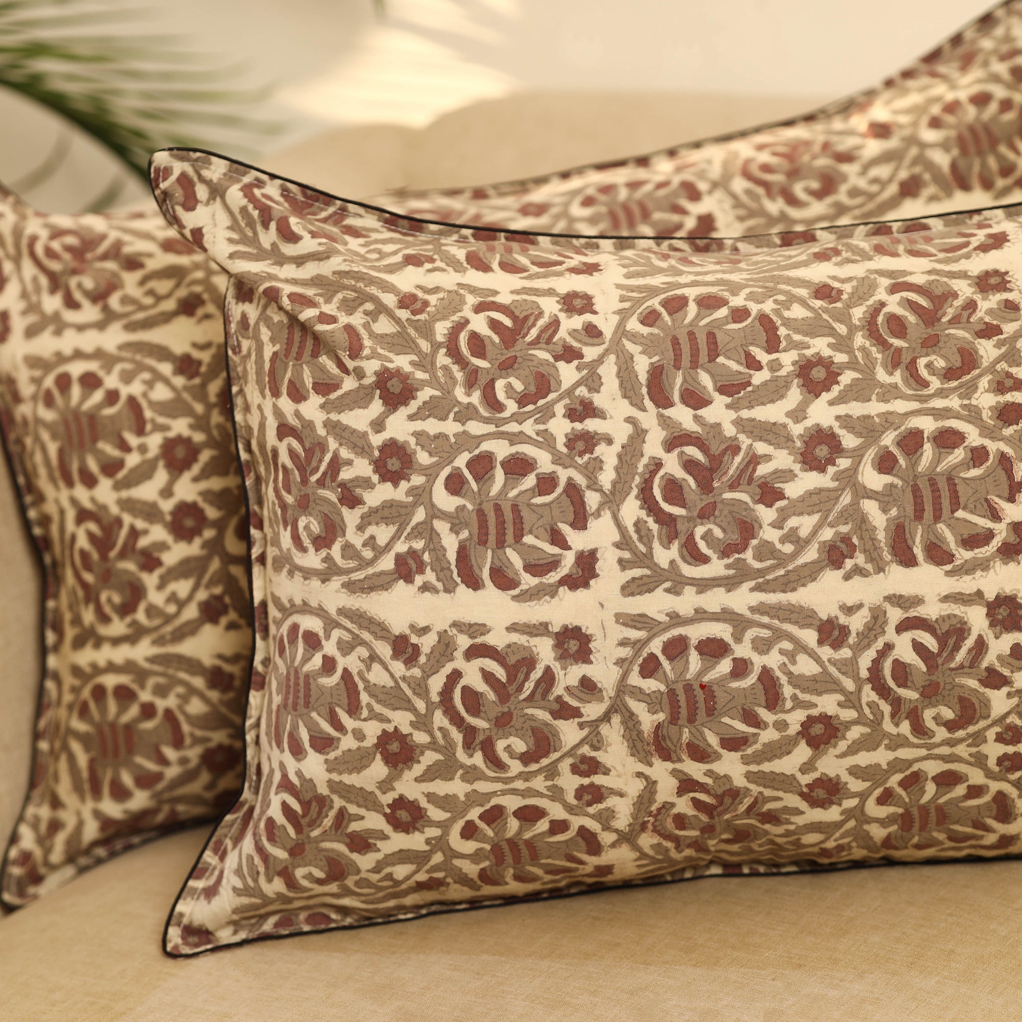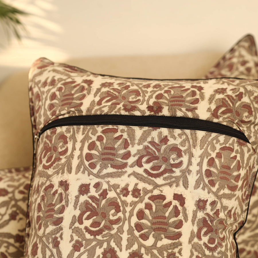 Add a touch of artisanal charm to your home with this set of 2 beige bagru block print cotton pillow covers. Crafted from premium Indian cotton, they feature intricate textures and rich patterns perfect for elevating the look of your bedroom, reading book, or lounge with elegance, comfort, and a traditional appeal.