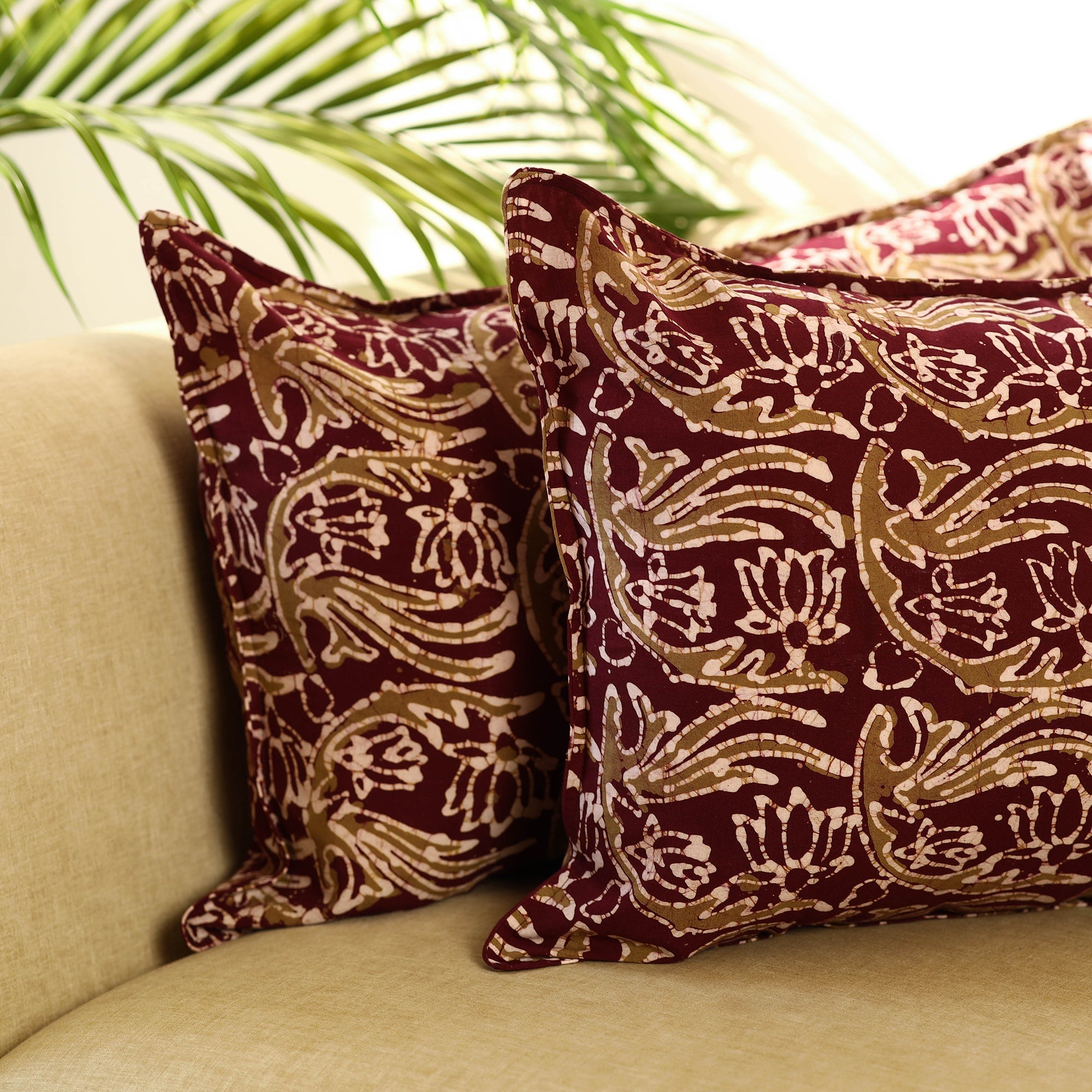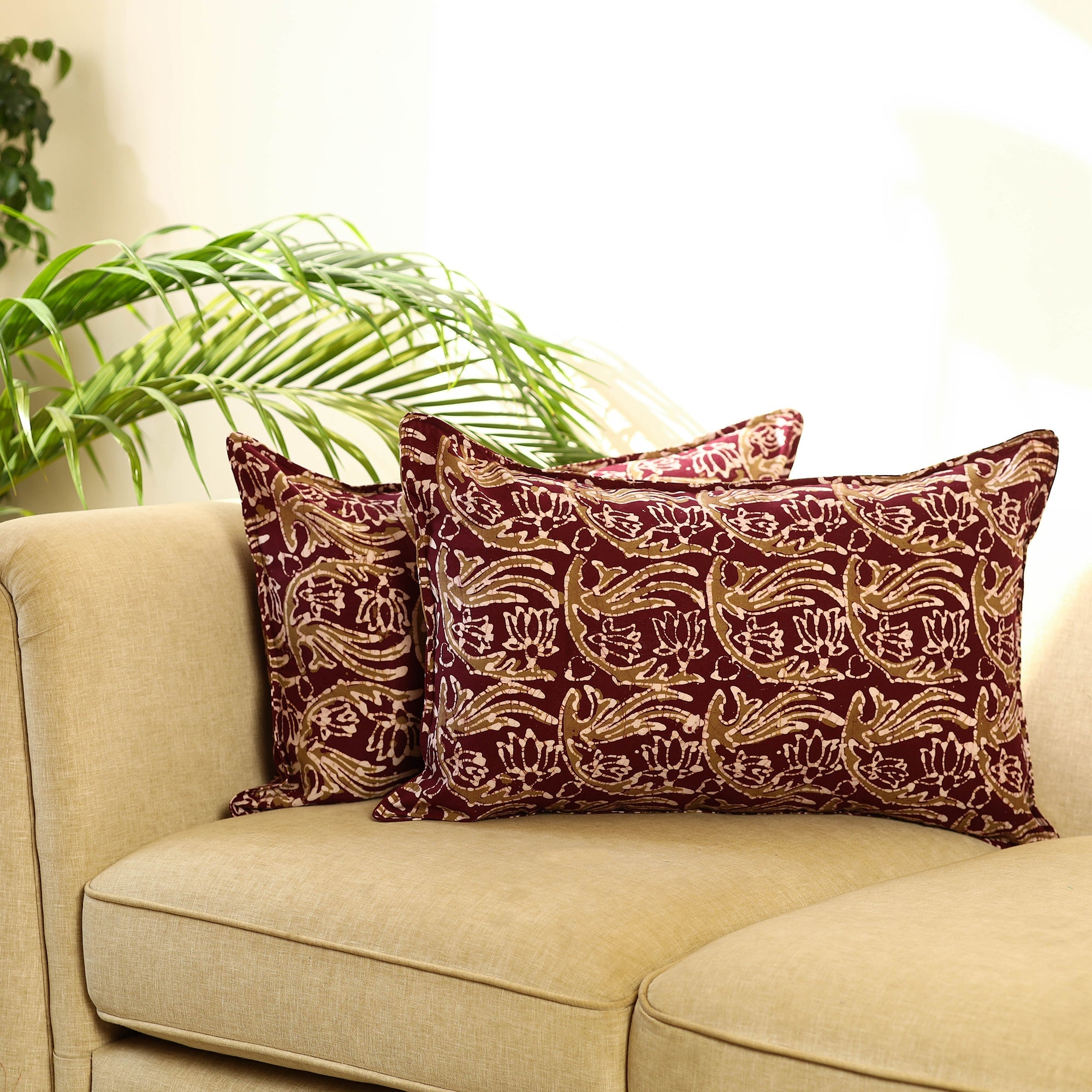 Elevate your space with this set of 2 maroon batik block-printed cotton pillow covers. Crafted using traditional block printing techniques, each cover features intricate motifs and vibrant colours. Perfect for adding an artistic touch to your living room or bedroom.