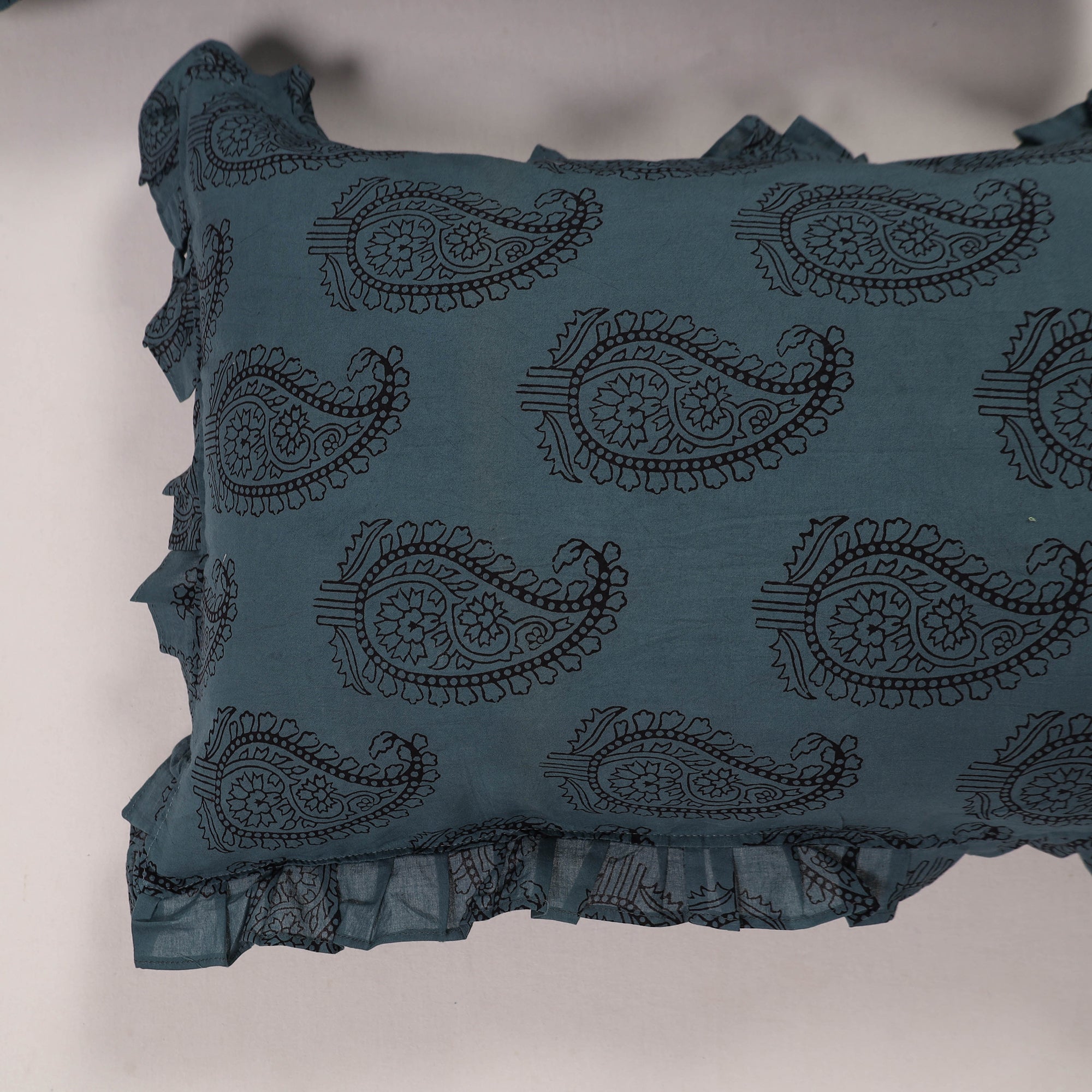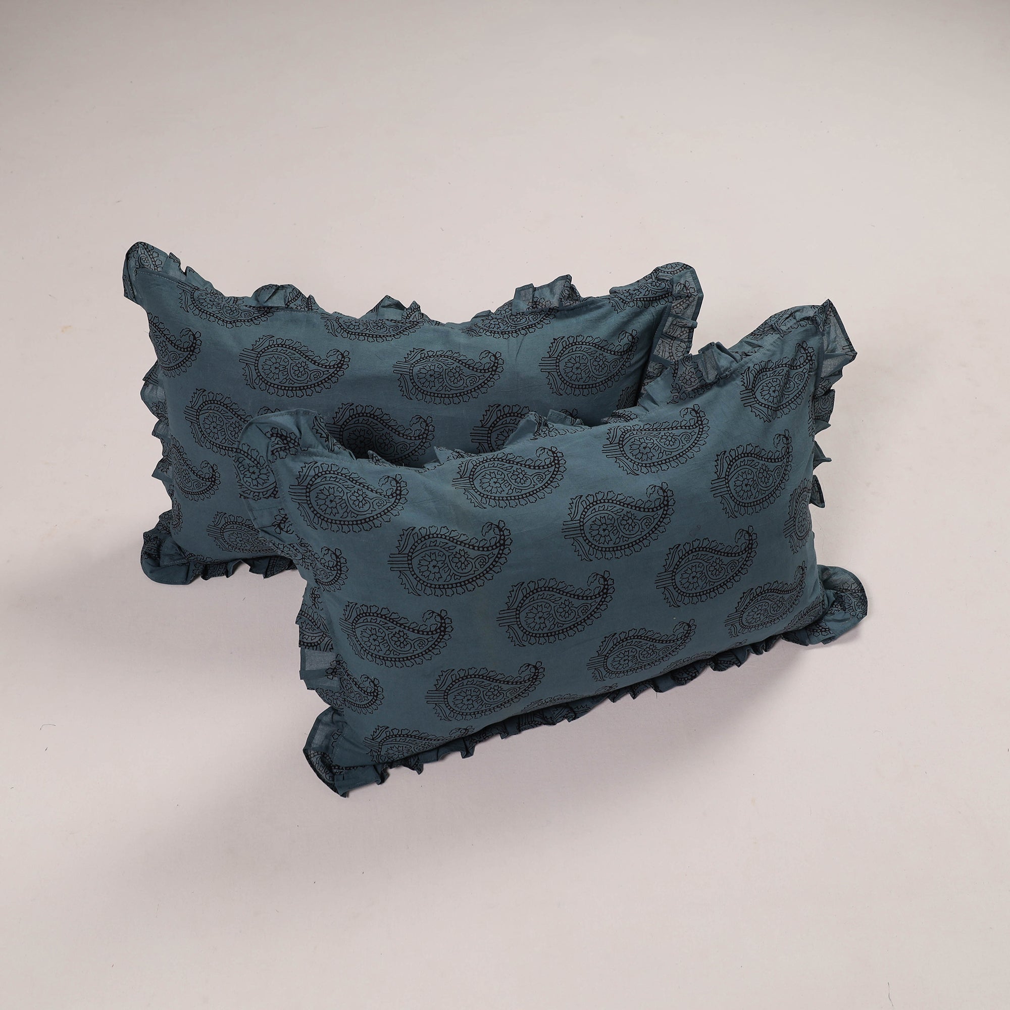 Enhance your home with our set of 2 blue handcrafted cotton frill pillow covers. These pillow covers bring a blend of traditional craftsmanship and modern. The cotton material is both durable and eco-friendly, perfect for adding a touch of style and sustainability to your living space bedroom. Each cover has frill accents for a charming look. Perfect for sustainable home decor.