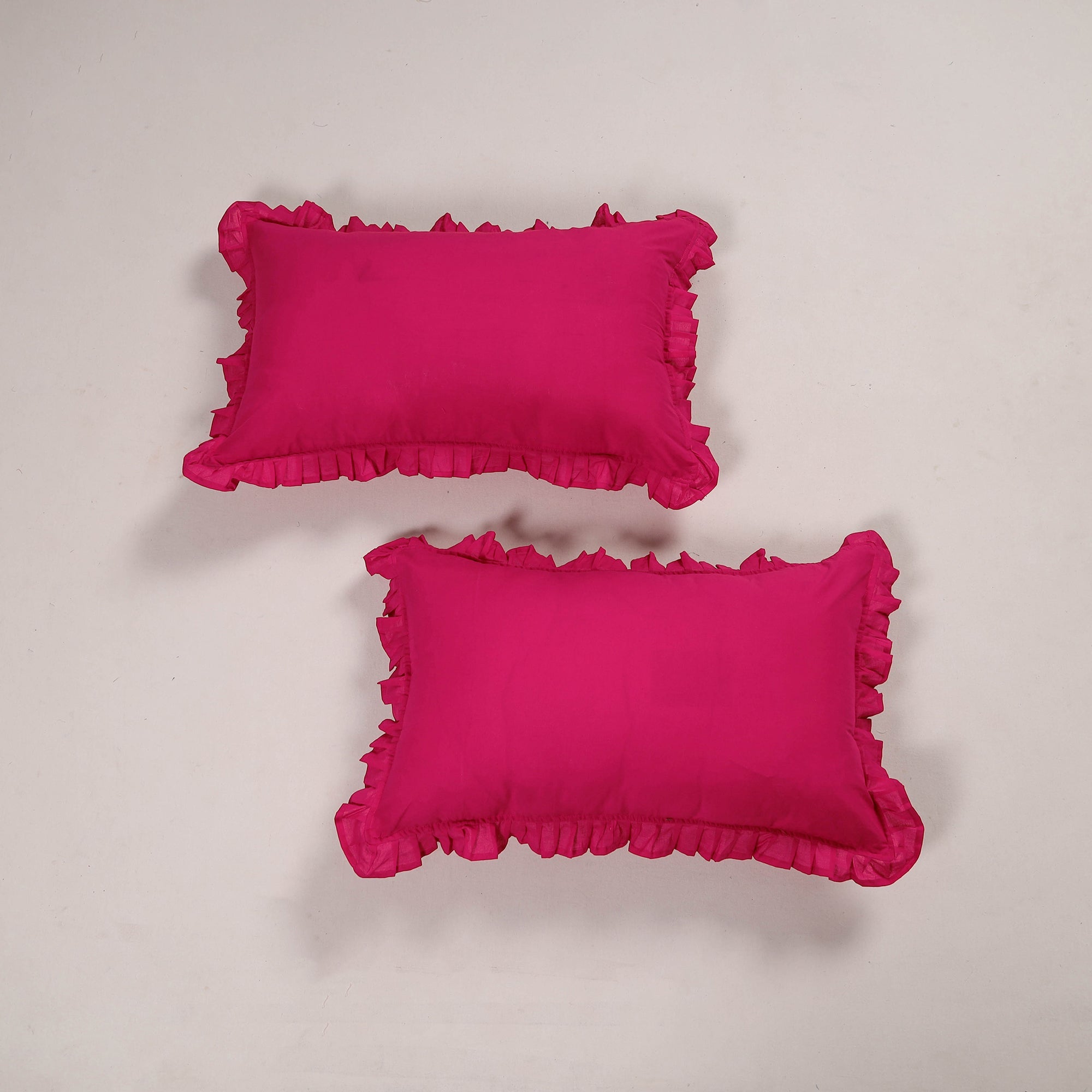 Enhance your home with our set of 2 pink handcrafted cotton frill pillow covers. These pillow covers bring a blend of traditional craftsmanship and modern. The cotton material is both durable and eco-friendly, perfect for adding a touch of style and sustainability to your living space bedroom. Each cover has frill accents for a charming look. Perfect for sustainable home decor.