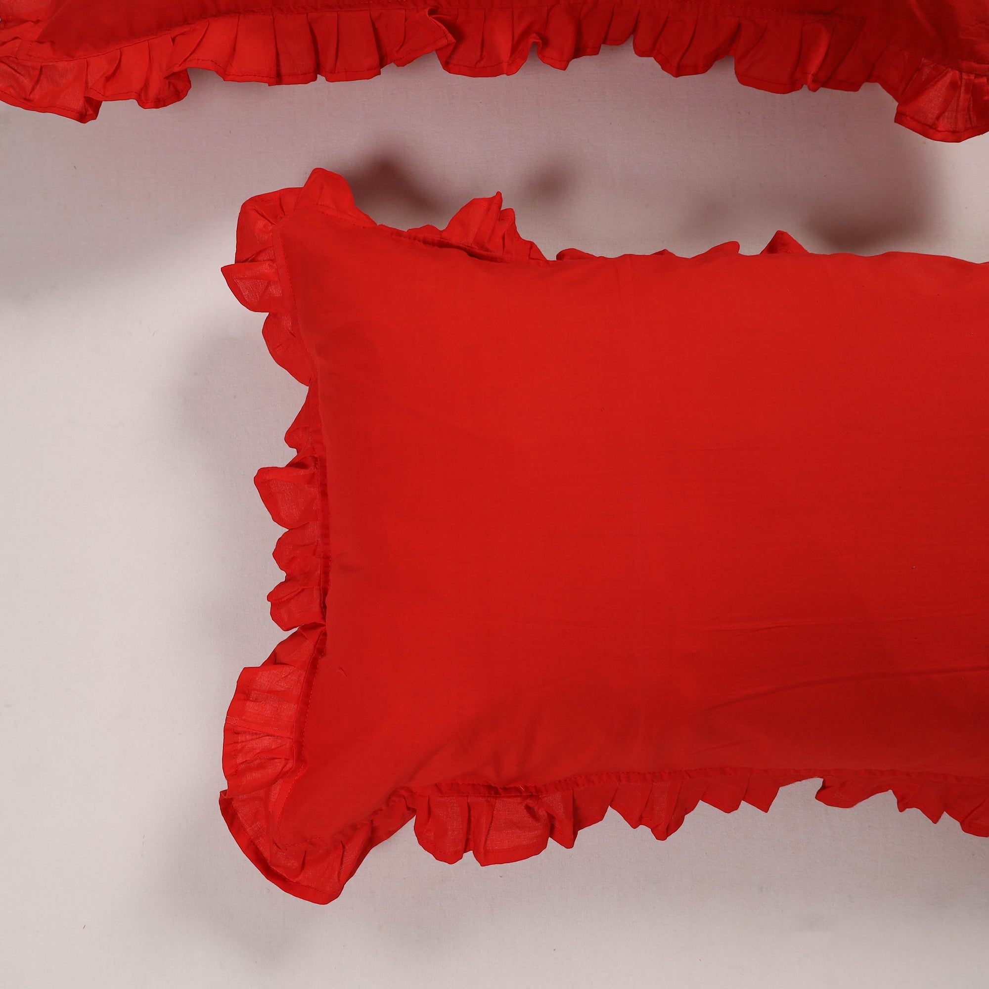 Enhance your home with our set of 2 red handcrafted cotton frill pillow covers. These pillow covers bring a blend of traditional craftsmanship and modern. The cotton material is both durable and eco-friendly, perfect for adding a touch of style and sustainability to your living space bedroom. Each cover has frill accents for a charming look. Perfect for sustainable home decor.