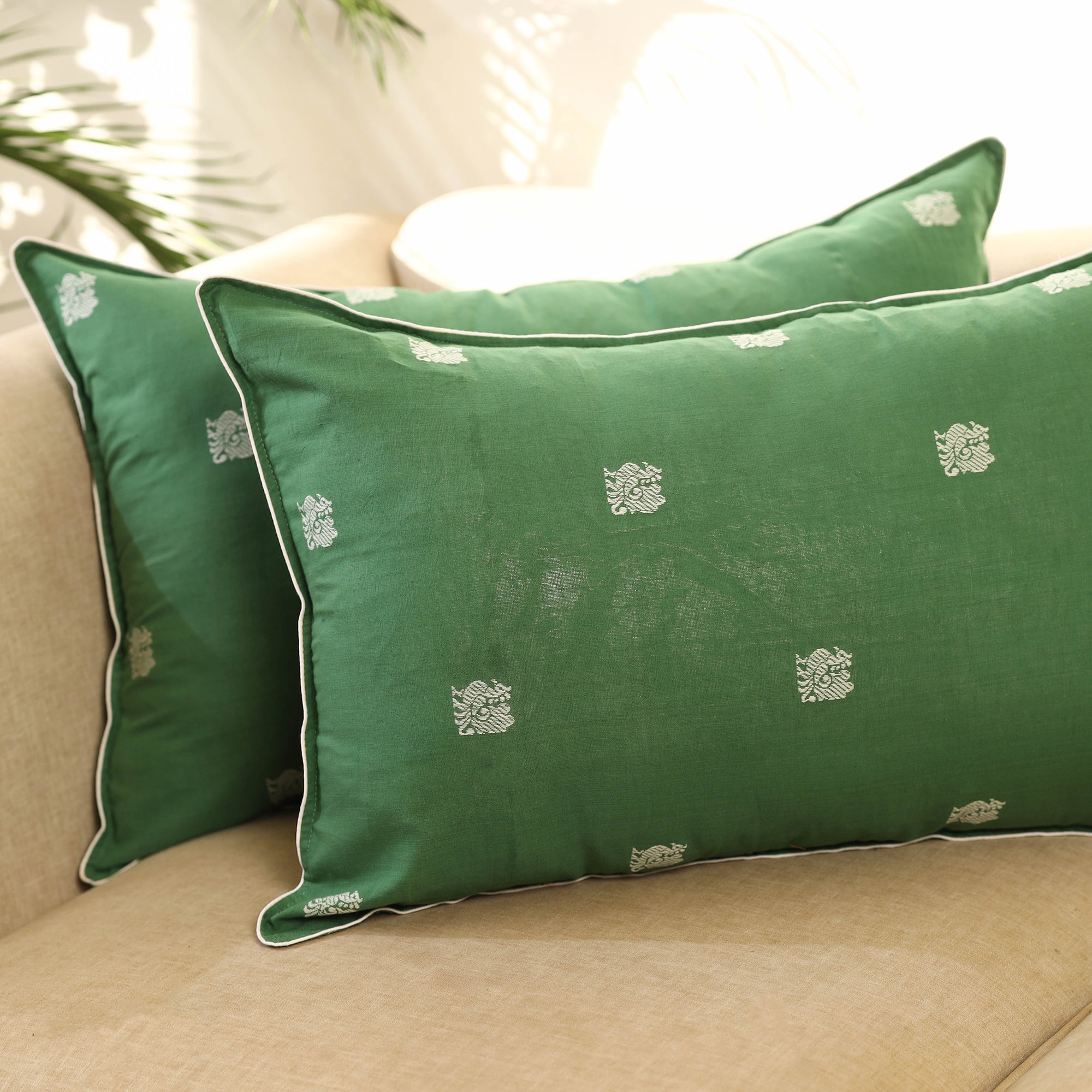 Add a touch of artisanal charm to your home with this set of 2 green jacquard cotton pillow covers. Crafted from premium Indian fabric, they showcase intricate textures and rich patterns. Perfect for elevating the look of your bedroom, reading book, or lounge with elegance, comfort, and traditional appeal.