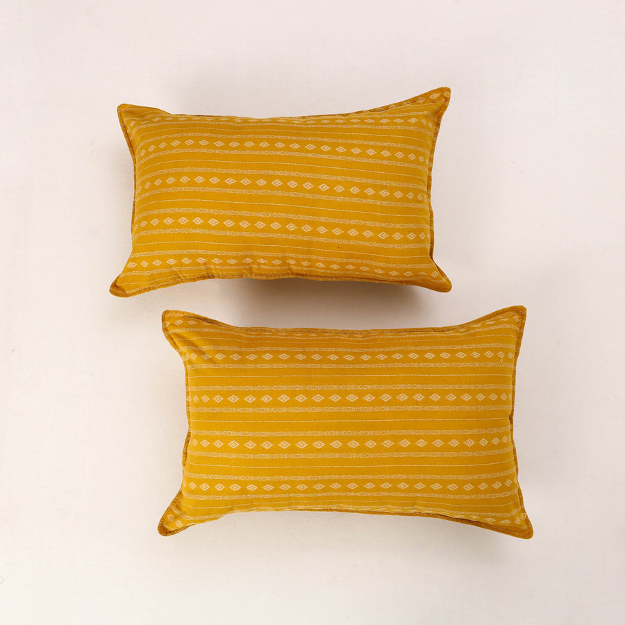 | Material | Set of 2 yellow jacquard cotton pillow covers. Made by skilled artisans, these pillow covers bring a blend of traditional craftsmanship and modern. The cotton material is both durable and eco-friendly, perfect for adding a touch of style and sustainability to your living space & bedroom. |