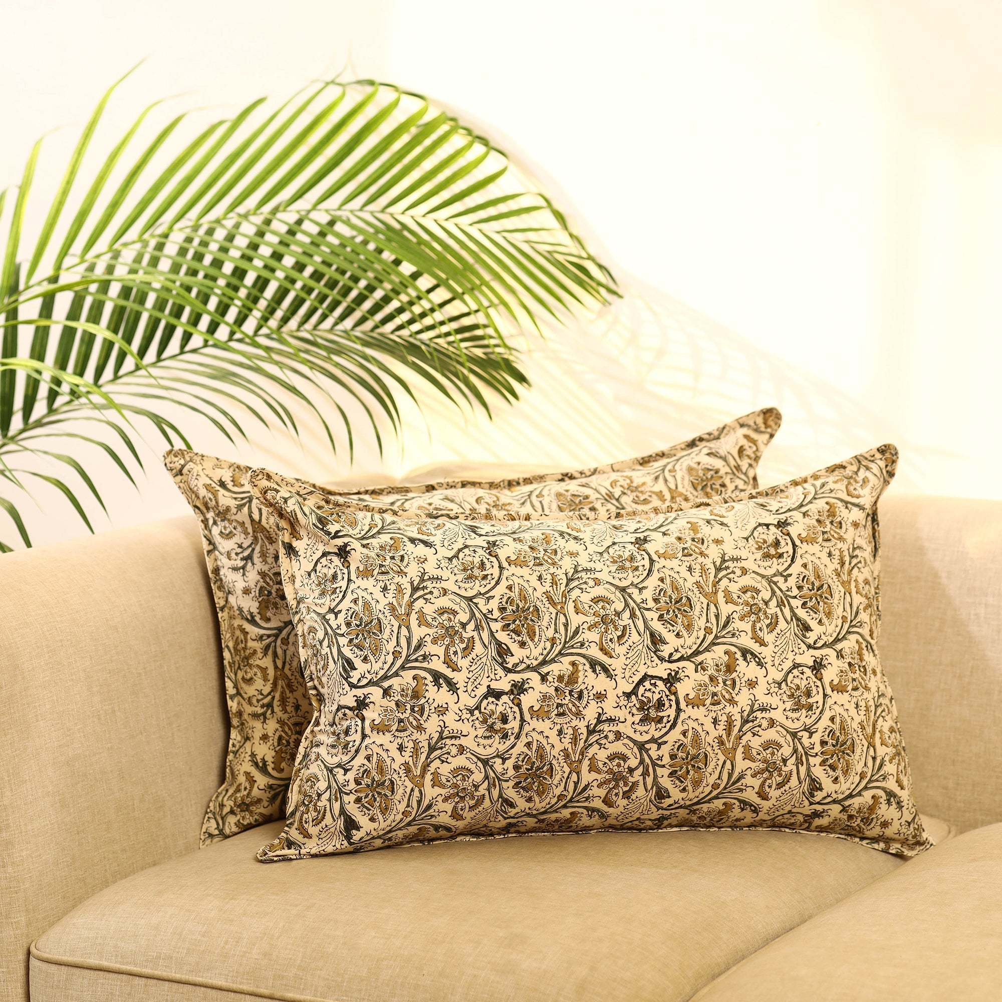 Add a story to your sofa or bed with this set of 2 beige Kalamkari block print cotton pillow covers. Each piece is handcrafted by skilled artisans, echoing the age-old charm of Indian artistry. The soft yet sturdy cotton brings comfort and longevity, while the earthy prints make your home feel both rooted and refreshing.