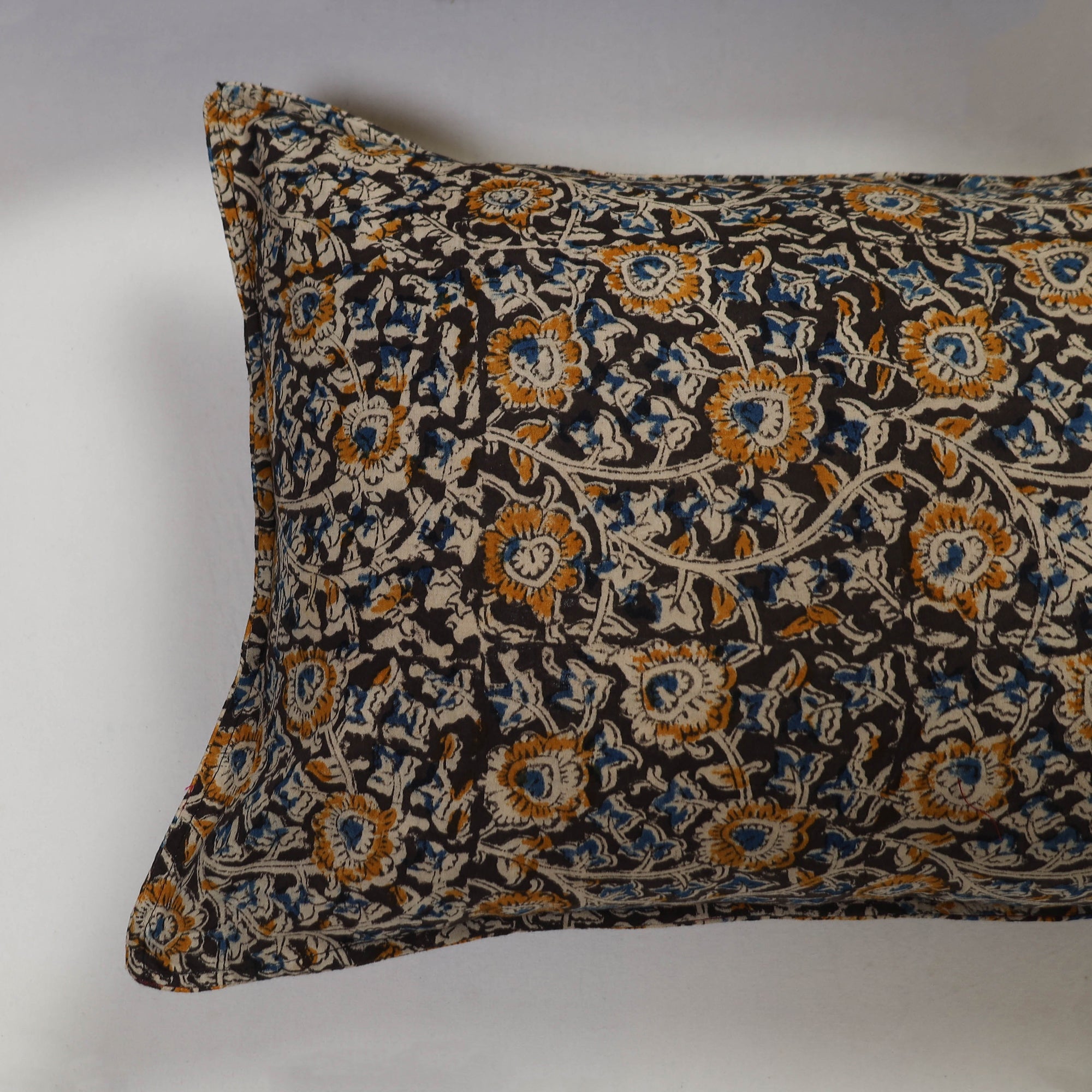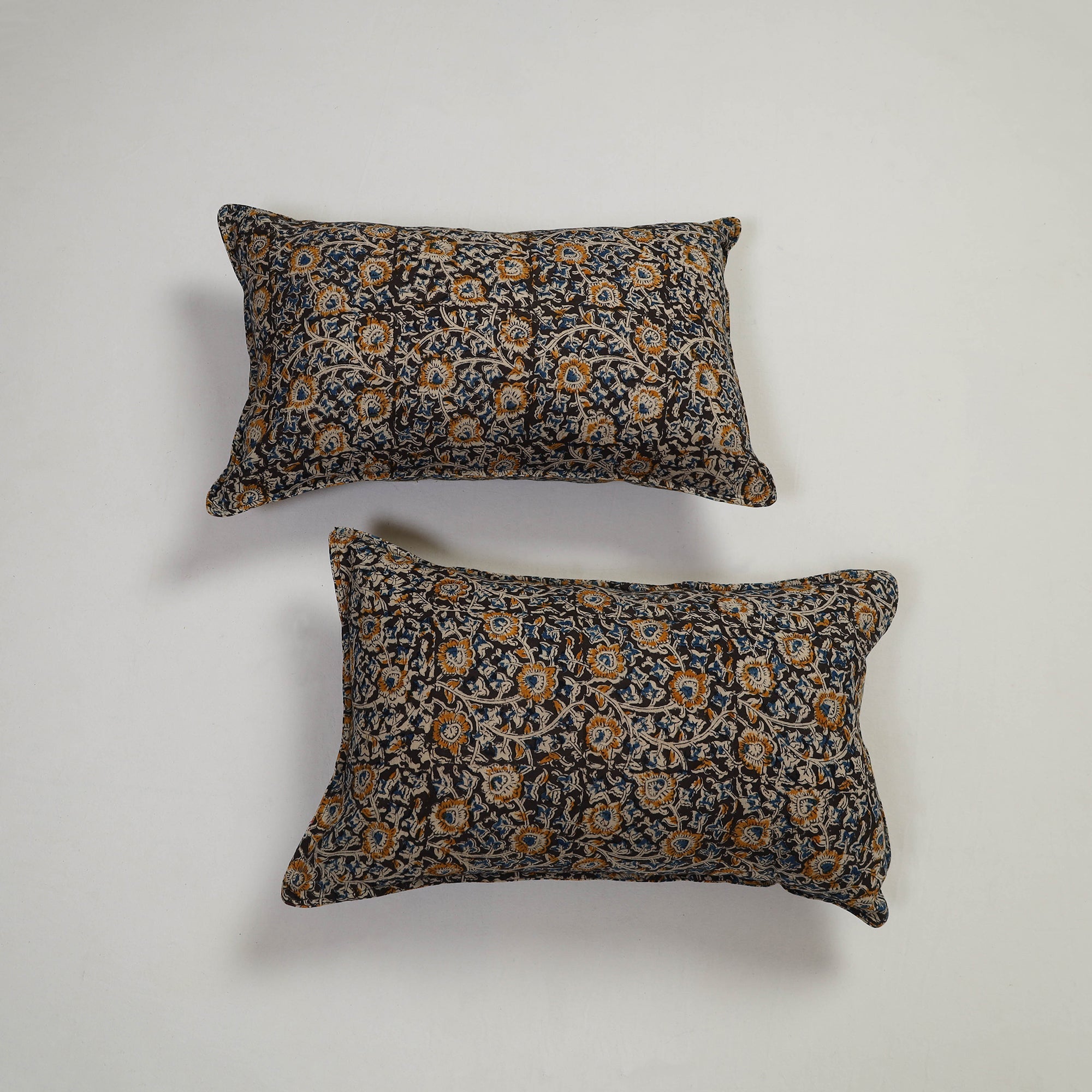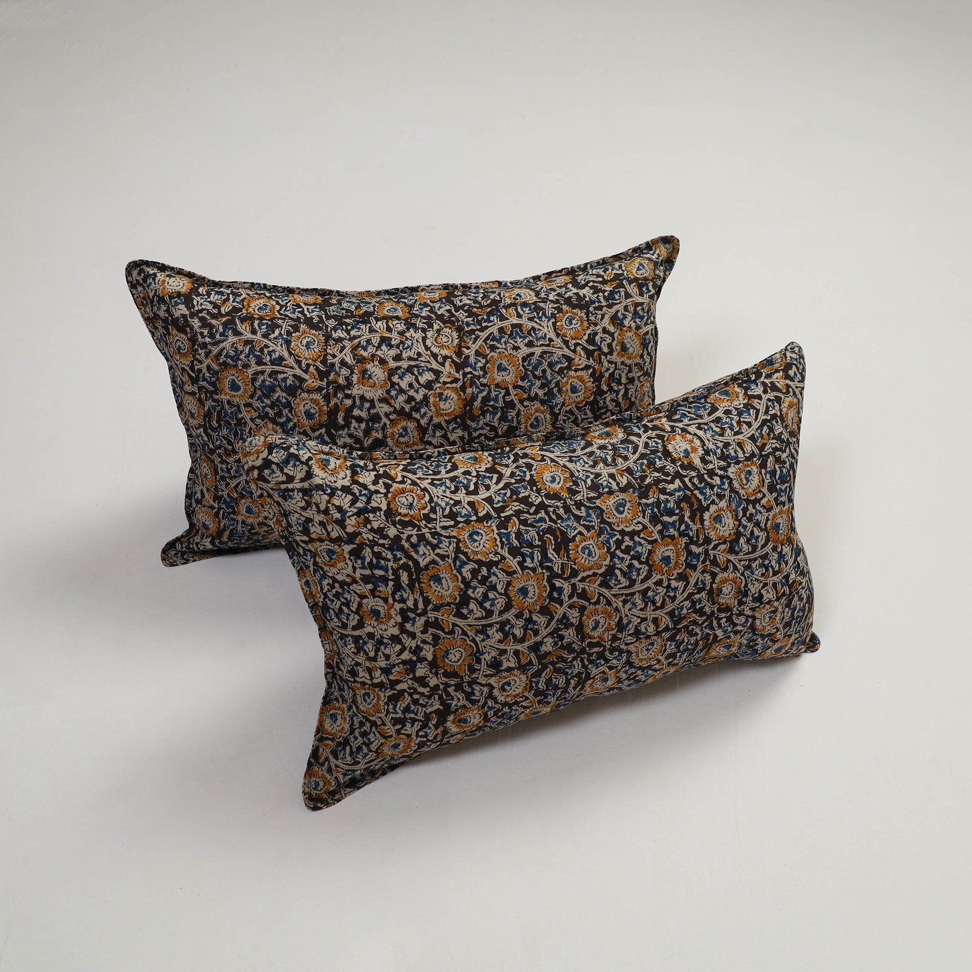 Enhance your bedroom with our set of 2 black kalamkari block print cotton pillow covers, textured with handmade textiles of India. These covers blend traditional craftsmanship with modern design, making them perfect for adding a charming, artisanal touch to any space.