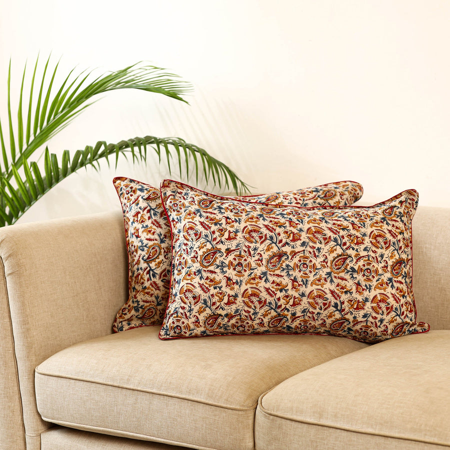 Add a cultural touch to your space with this beige set of 2 kalamkari block print cotton pillow covers. Crafted by skilled artisans using traditional techniques, each cover showcases vibrant patterns that reflect the richness of Indian textile art. Perfect for enhancing the look of your sofa, bed, or lounge corner.