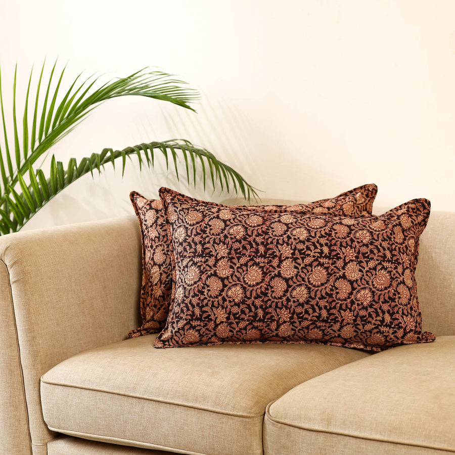 | Material | Add a cultural touch to your space with this black set of 2 kalamkari block print cotton pillow covers. Crafted by skilled artisans using traditional techniques, each cover showcases vibrant patterns that reflect the richness of Indian textile art. Perfect for enhancing the look of your sofa, bed, or lounge corner. |