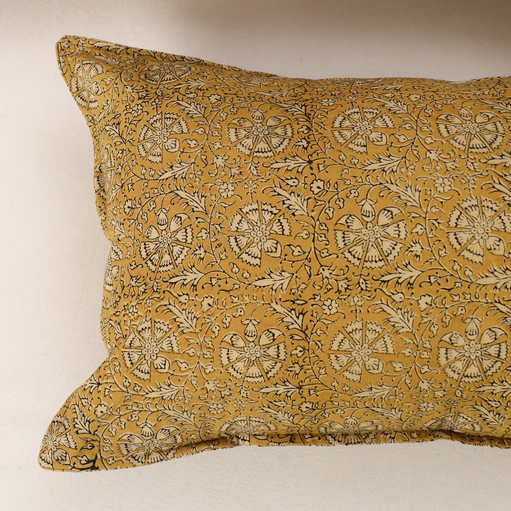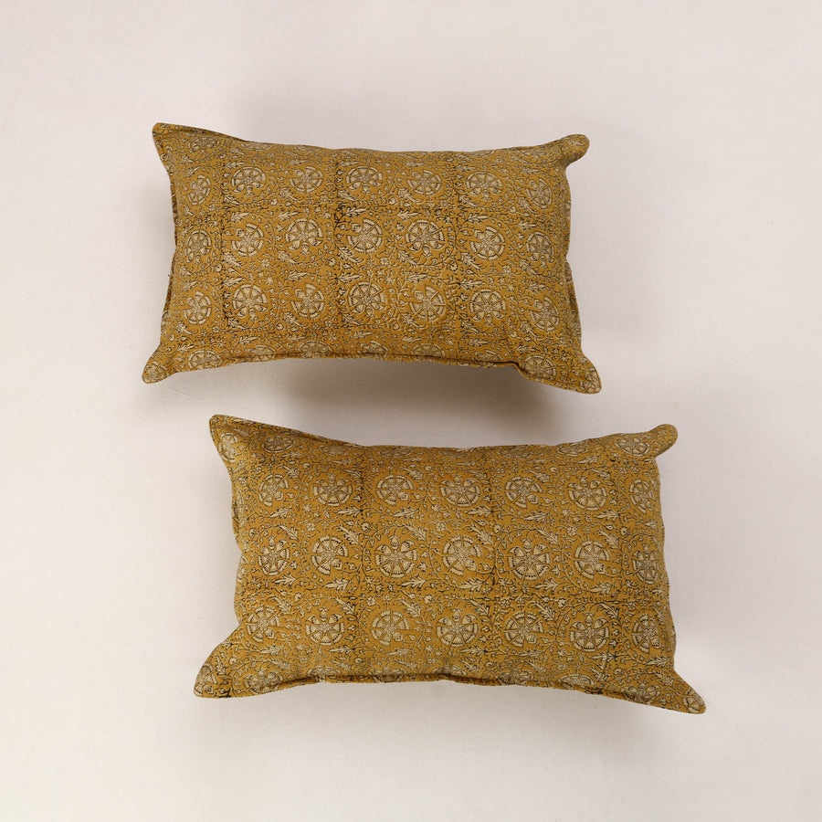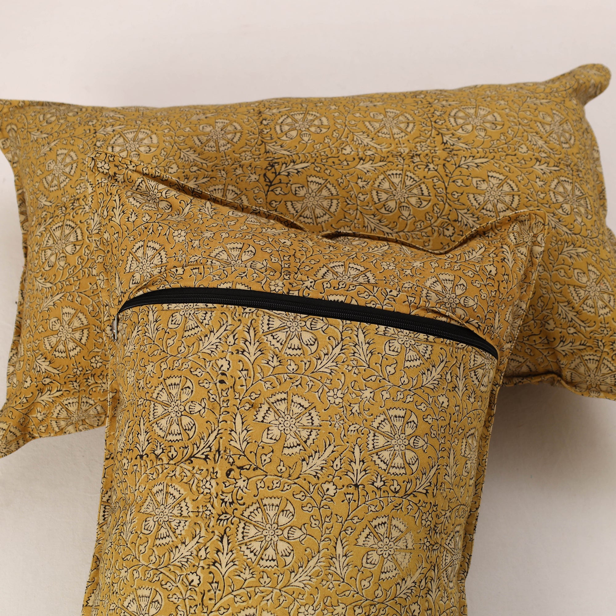 Set of 2 yellow kalamkari block print cotton pillow covers. Made by skilled artisans, these pillow covers bring a blend of traditional craftsmanship and modern. The cotton material is both durable and eco-friendly, perfect for adding a touch of style and sustainability to your living space & bedroom.
