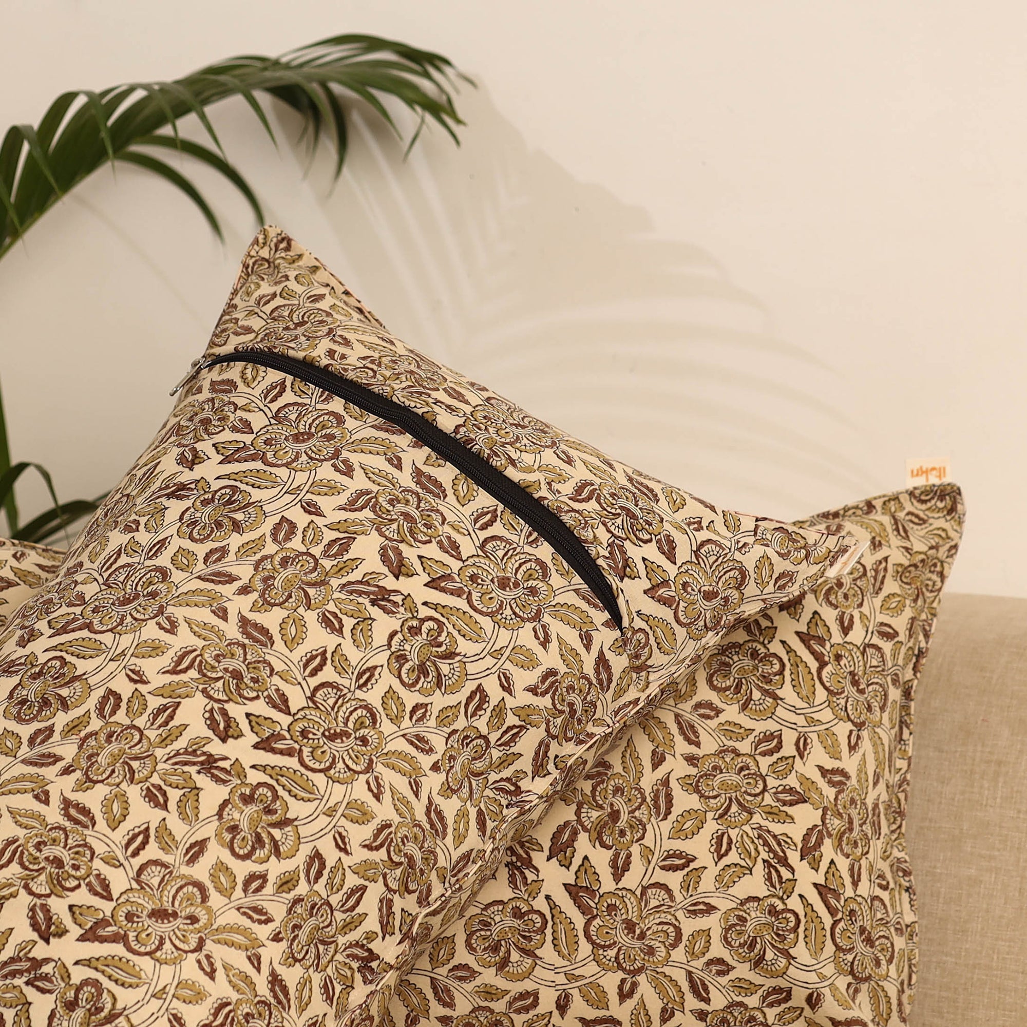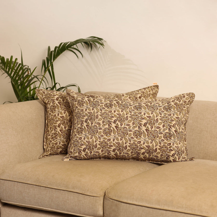 Beige set of 2 kalamkari hand block print pillow covers is made from pure cotton and crafted by skilled artisans using traditional techniques. Each cover features vibrant patterns inspired by Indian textile art, making them perfect for enhancing the look of your sofa, bed or lounge corner.