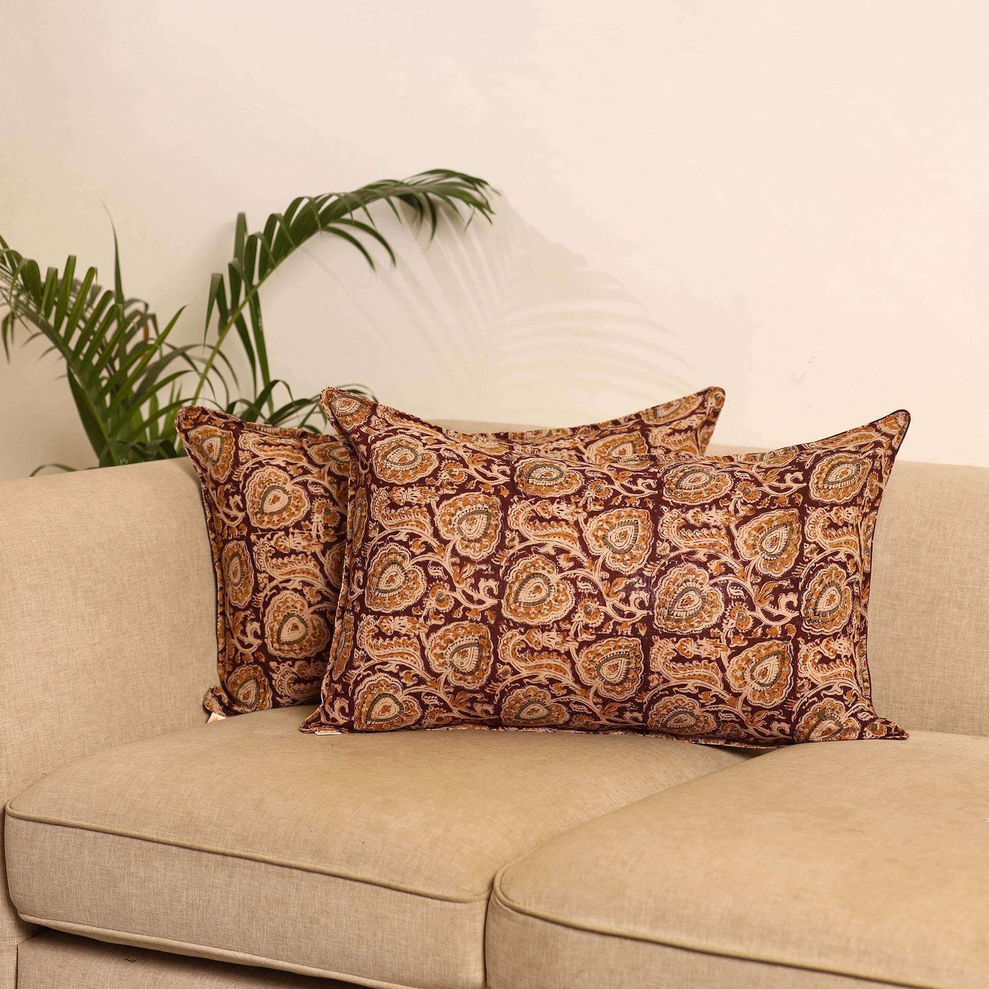Maroon set of 2 kalamkari hand block print pillow covers is made from pure cotton and crafted by skilled artisans using traditional techniques. Each cover features vibrant patterns inspired by Indian textile art, making them perfect for enhancing the look of your sofa, bed or lounge corner.