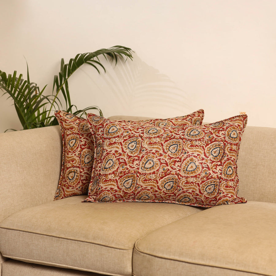 Red set of 2 kalamkari hand block print pillow covers is made from pure cotton and crafted by skilled artisans using traditional techniques. Each cover features vibrant patterns inspired by Indian textile art, making them perfect for enhancing the look of your sofa, bed or lounge corner.