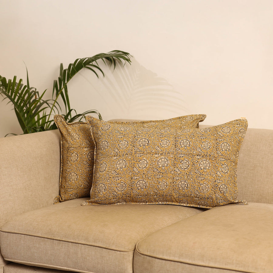 Beige set of 2 kalamkari hand block print pillow covers is made from pure cotton and crafted by skilled artisans using traditional techniques. Each cover features vibrant patterns inspired by Indian textile art, making them perfect for enhancing the look of your sofa, bed or lounge corner.