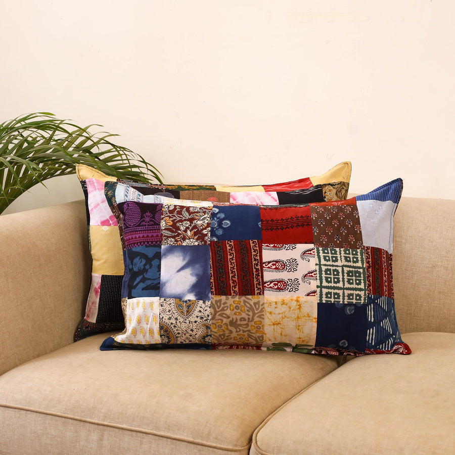 Set of 2 patchwork pillow covers is made from neatly stitched cotton pieces, showing the beauty of Indian textile work. Each cover has colourful patterns and a clean, handmade look. They are perfect for adding a warm, unique touch to any room and work well with both simple and traditional home decor.