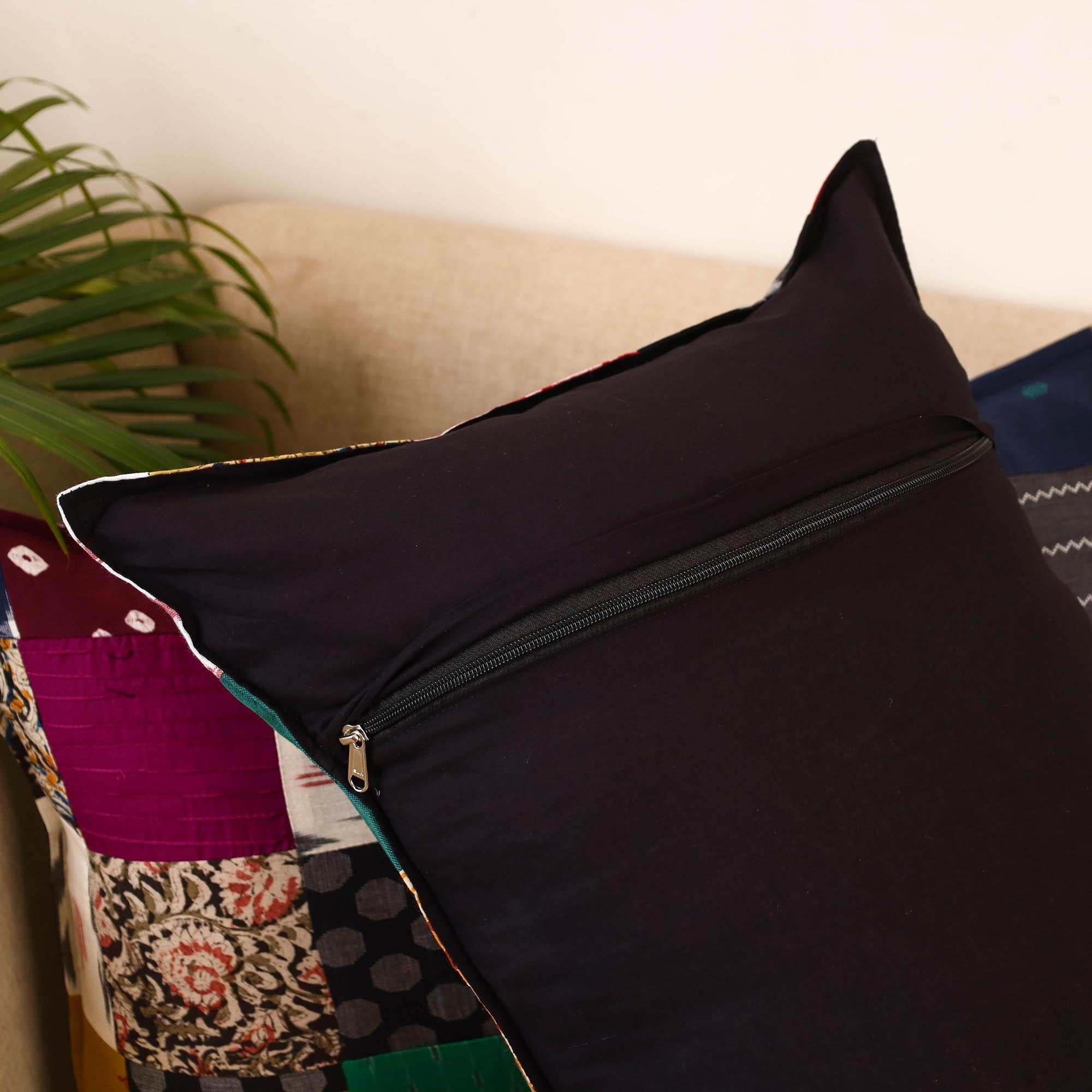 Set of 2 patchwork pillow covers is made from neatly stitched cotton pieces, showing the beauty of Indian textile work. Each cover has colourful patterns and a clean, handmade look. They are perfect for adding a warm, unique touch to any room and work well with both simple and traditional home decor.