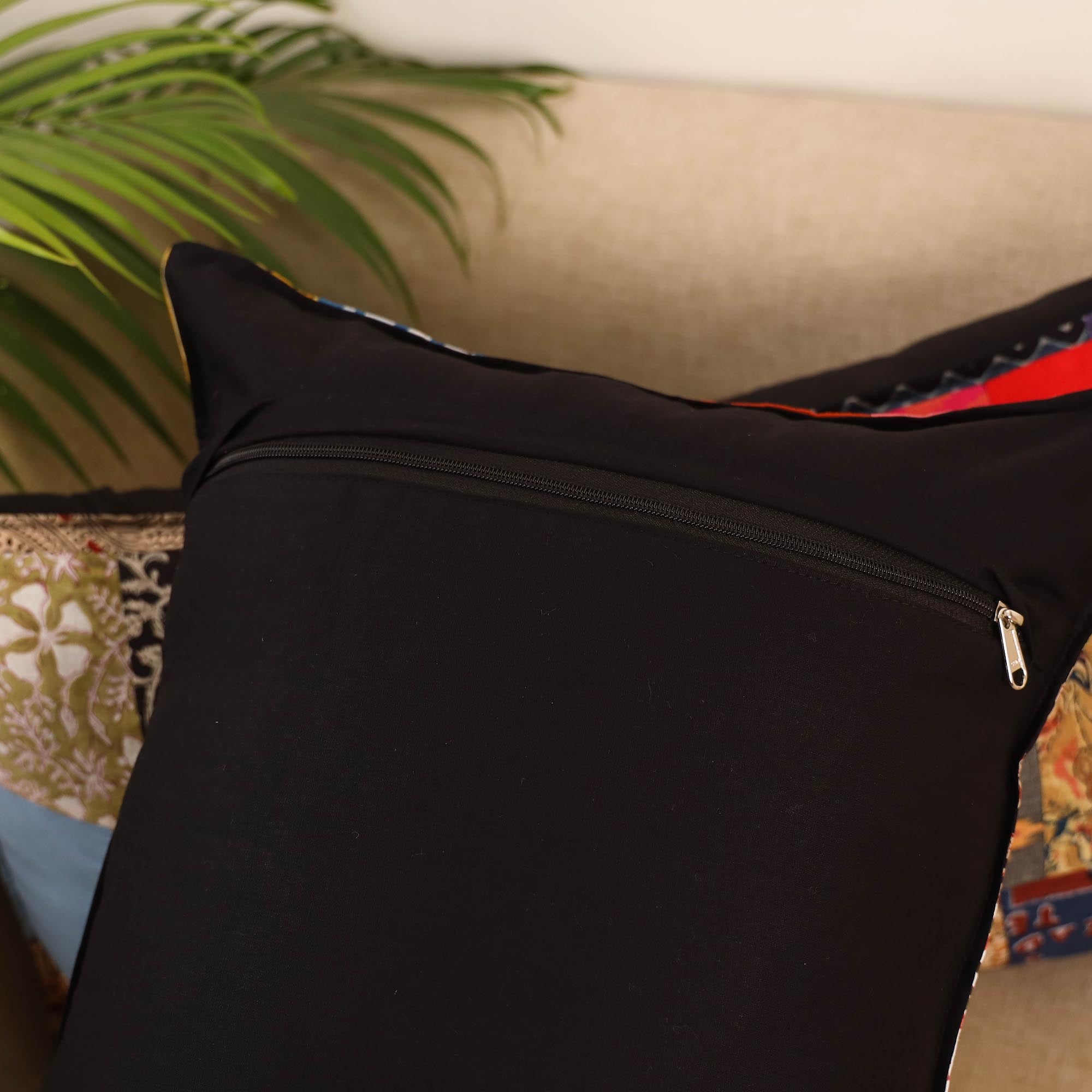 Set of 2 patchwork pillow covers is made from neatly stitched cotton pieces, showing the beauty of Indian textile work. Each cover has colourful patterns and a clean, handmade look. They are perfect for adding a warm, unique touch to any room and work well with both simple and traditional home decor.