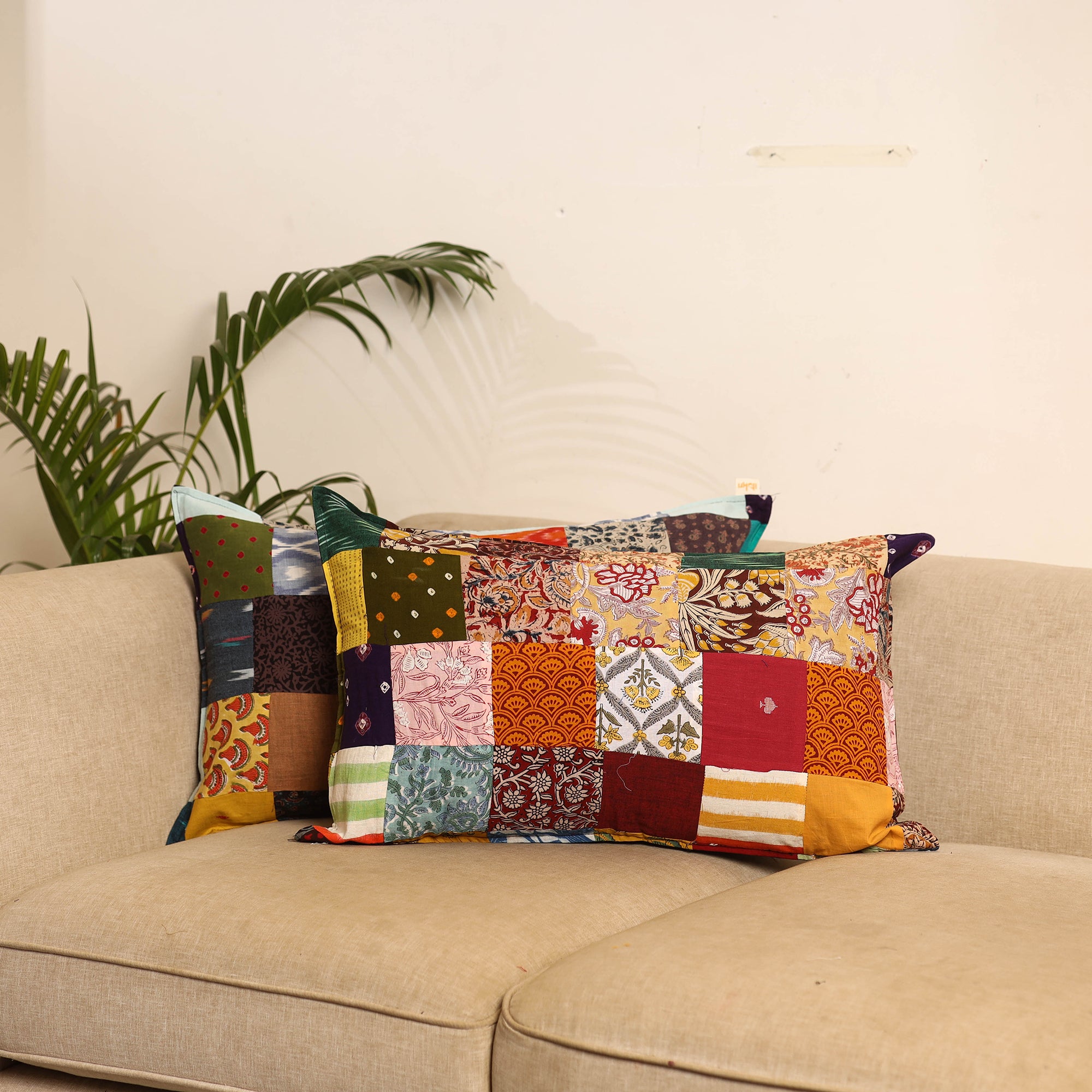 Set of 2 patchwork pillow covers is made from cotton and crafted by skilled artisans using traditional techniques. Each cover features vibrant patterns inspired by Indian textile art, making them perfect for enhancing the look of your sofa, bed or lounge corner.