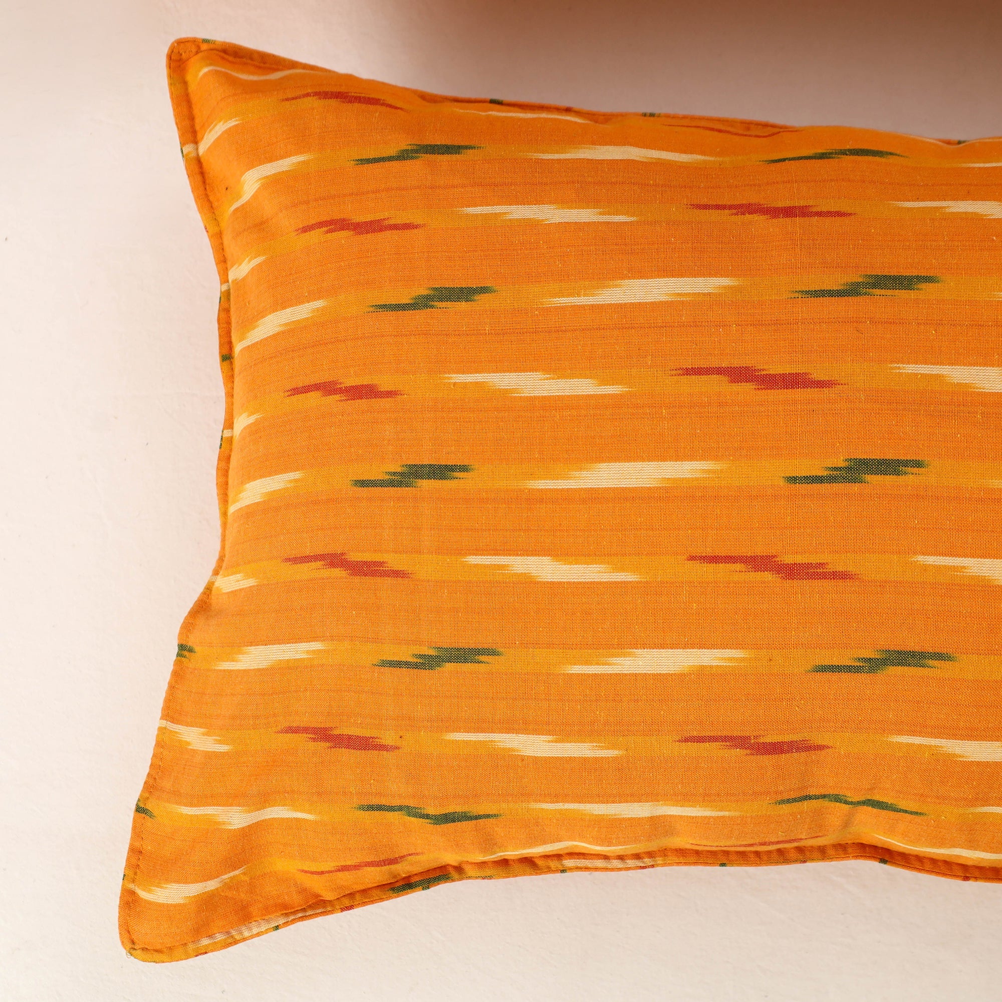 Set of 2 orange pochampally ikat cotton pillow covers. Made by skilled artisans, these pillow covers bring a blend of traditional craftsmanship and modern. The cotton material is both durable and eco-friendly, perfect for adding a touch of style and sustainability to your living space & bedroom.