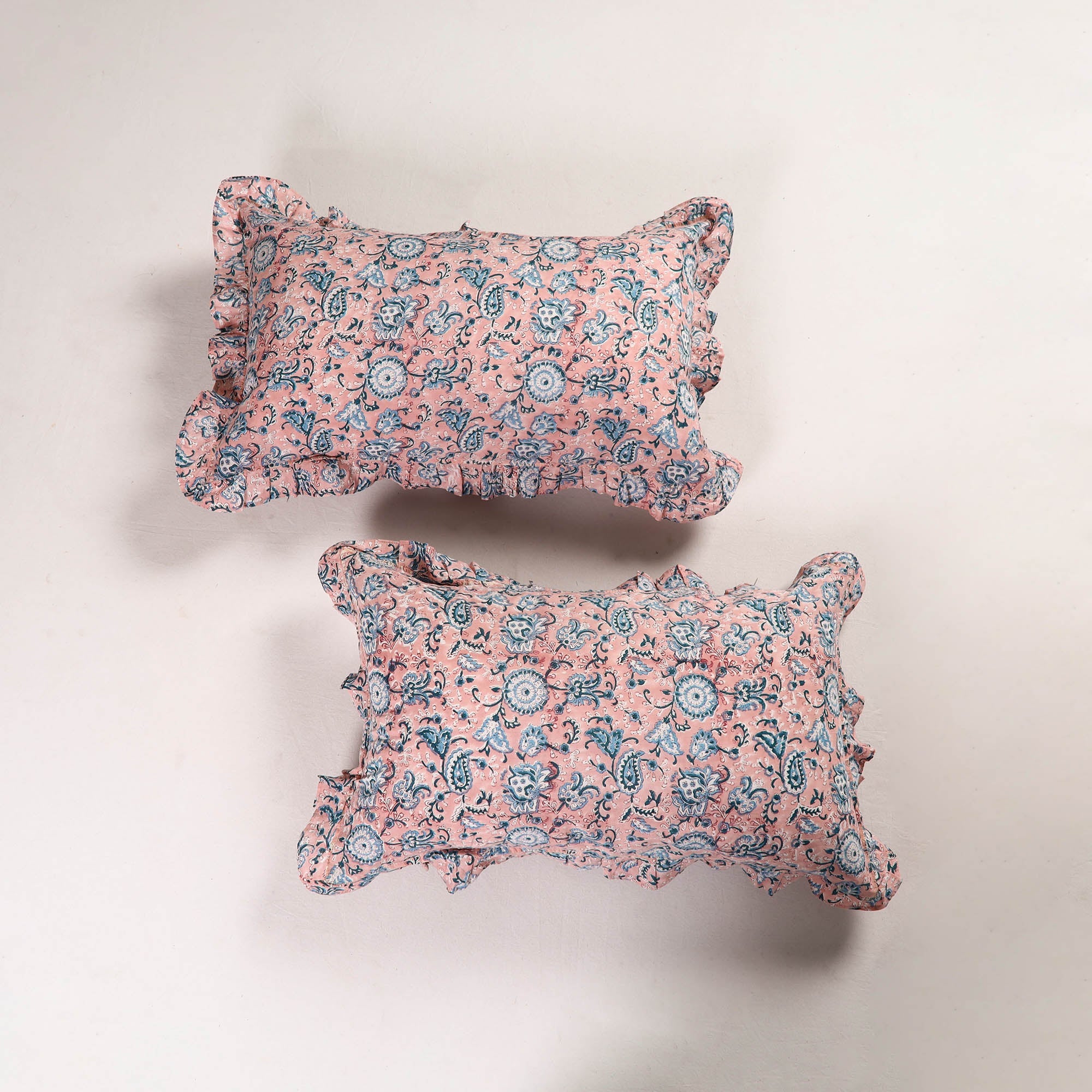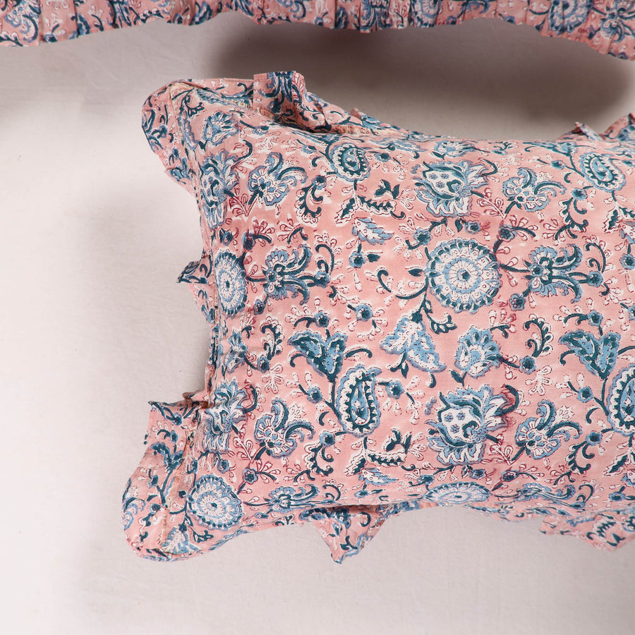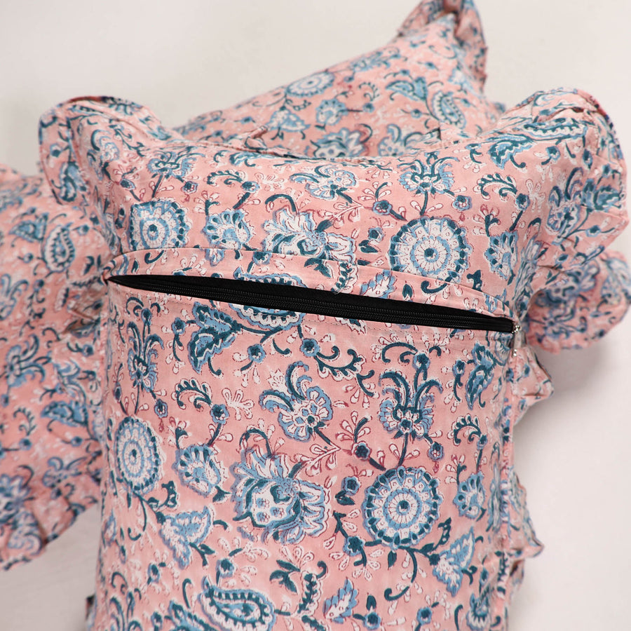 Enhance your home with our light pink set of 2 sanganeri block print cotton frill pillow covers. Made by skilled artisans, these pillow covers bring a blend of traditional craftsmanship and modern. The cotton material is both durable and eco-friendly, perfect for adding a touch of style and sustainability to your living space & bedroom.