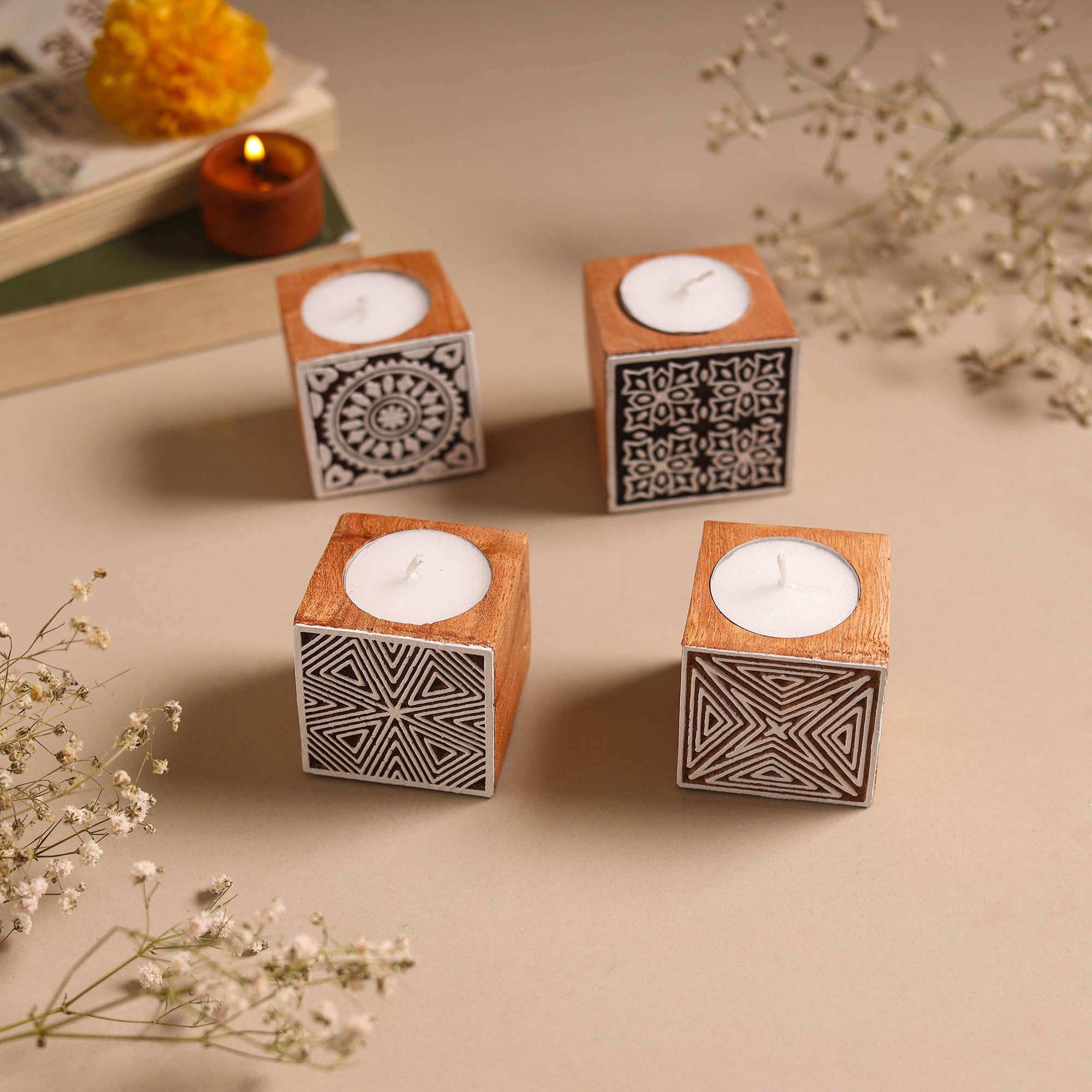 Add an artisanal touch to your home with this set of 4 hand-carved tealight holders, crafted from natural bakayan wood. Meticulously carved using traditional wood block techniques, these tealight holders light up your space but can also be used as printing blocks on fabric or paper. A harmonious blend of utility and décor, handmade by skilled Indian artisans.